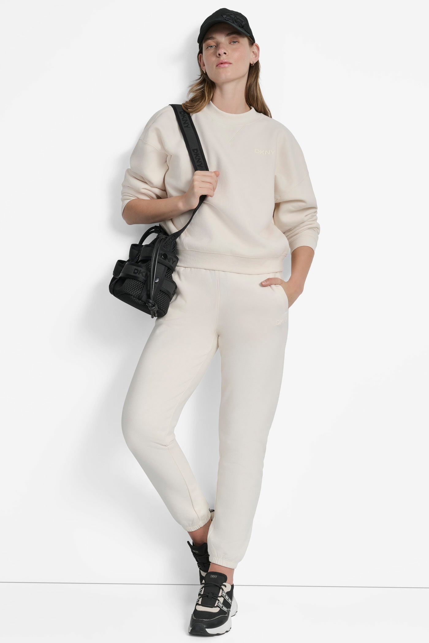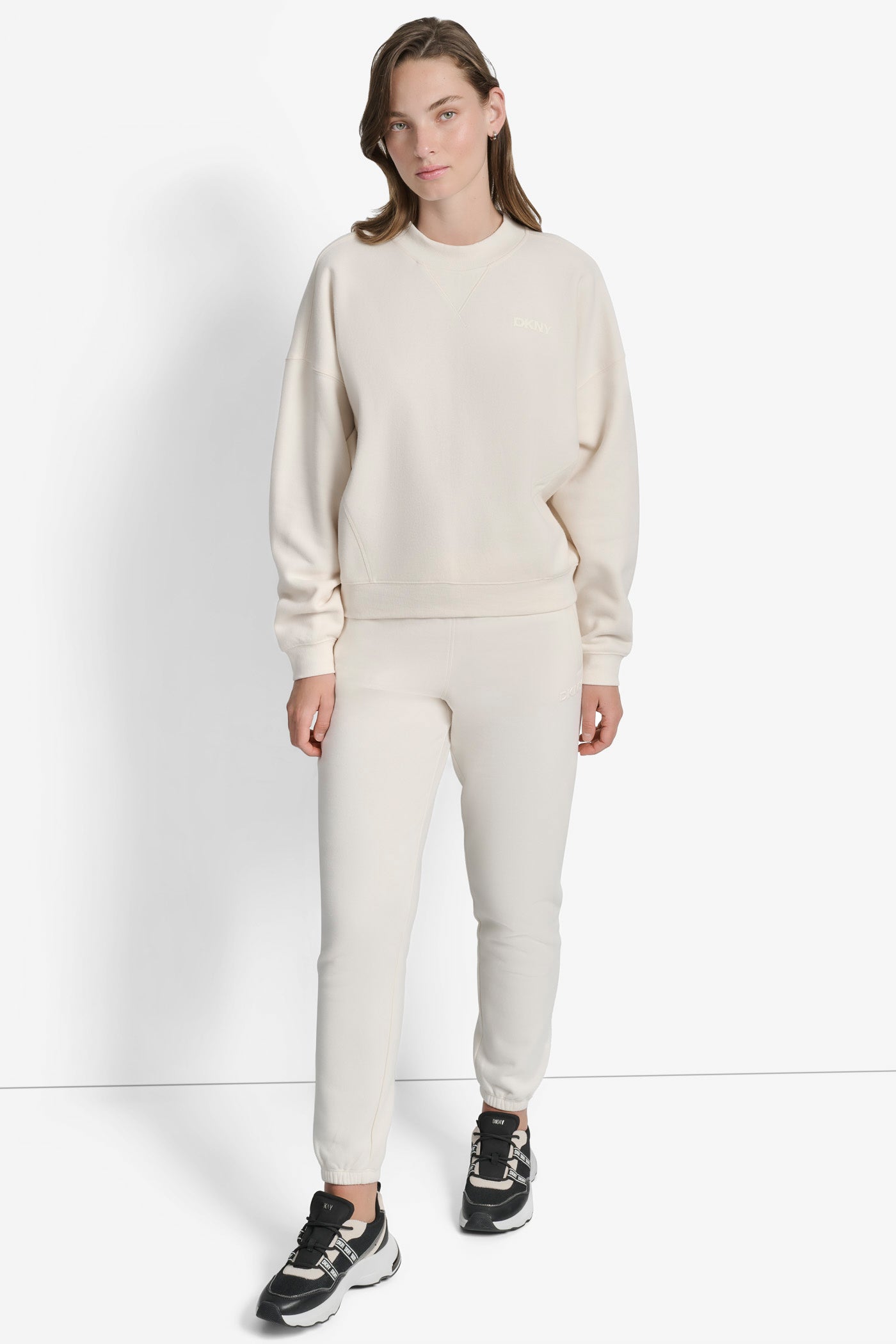 ارتقِ بإطلالتك الكاجوال مع سويت شيرت دكني بفتحة ياقة مستديرة ومزين بشعار العلامة باللون الأبيض الكلاسيكي. يتميز هذا السويت شيرت المريح بشعار دكني الأيقوني، وحاشية مضلعة، وقصة مريحة مثالية للارتداء فوق ملابس أخرى أو لإضافة لمسة أنيقة إلى خزانة ملابسك اليومية.