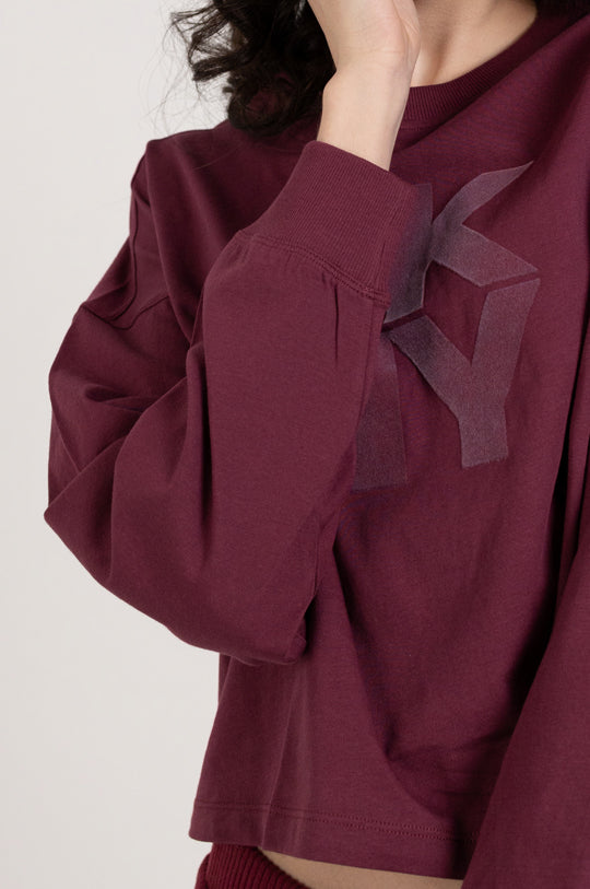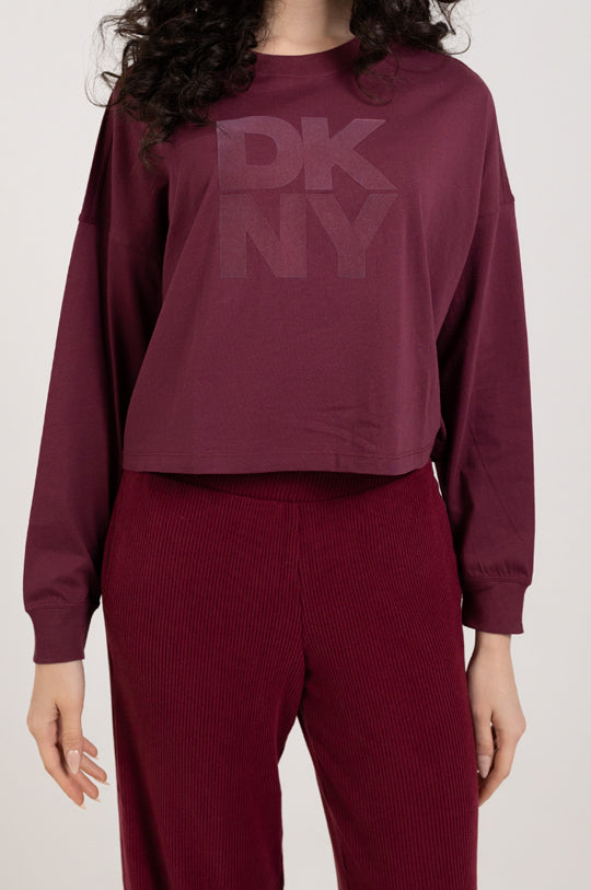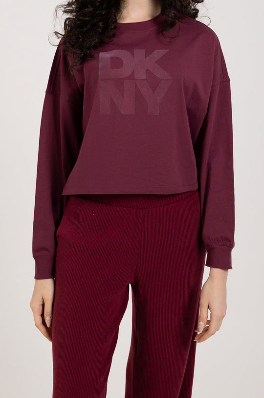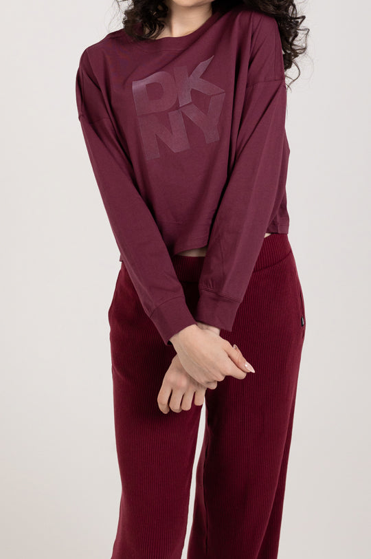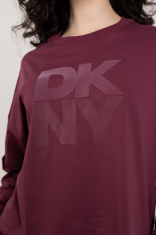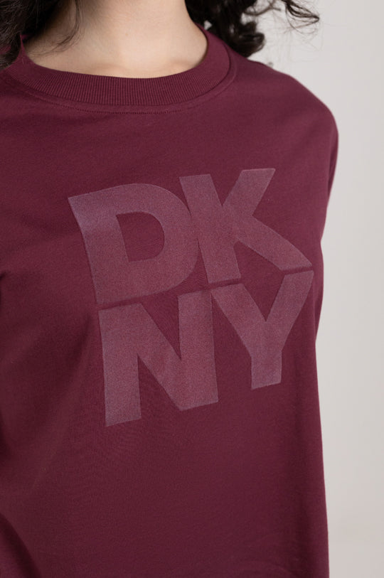 ارتقِ بإطلالتك الرياضية مع تي شيرت بأكمام طويلة وياقة مستديرة مع شعار الماركة المتداخل باللون العنابي الداكن من دكني. يمزج هذا الاختيار لخريف 2024 ما بين الراحة والرقي، ويعد مثالياً للارتداء فوق ملابس أخرى أو بشكل مستقل. يضفي تصميم الشعار الجريء لمسة أنيقة على أي مجموعة ملابس.