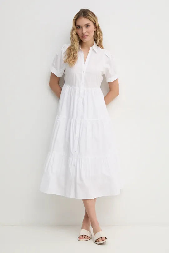 حسّني خزانة ملابسك مع قماش البوبلين بأزرار أمامية من DKNY. هذه القطعة البيضاء الناصعة الخالدة تجمع بين الرقي والراحة بكل سهولة. مثالية للمناسبات الرسمية وغير الرسمية، بفضل تصميمها المتنوع الذي يضمن لكِ إطلالة أنيقة دائمًا، مهما كانت المناسبة.