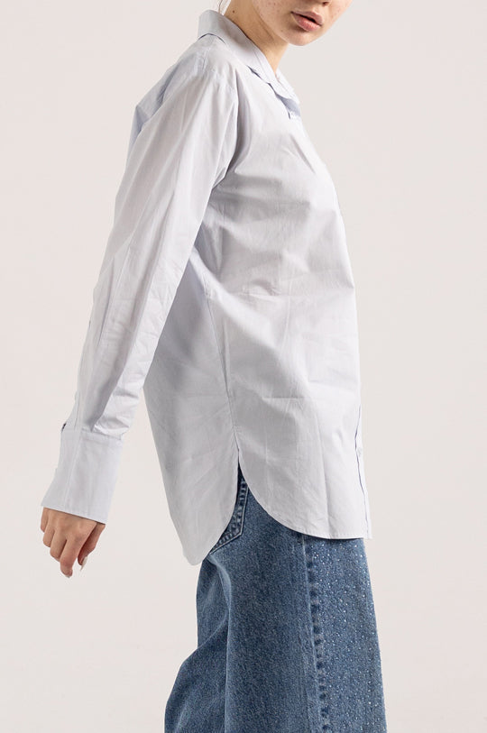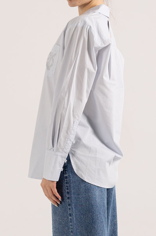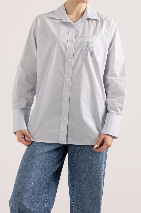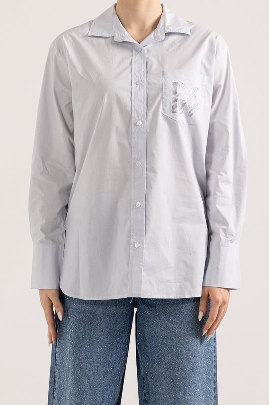 قميص بأكمام طويلة وأزرار أمامية مع شعار مرصع بأحجار الراين