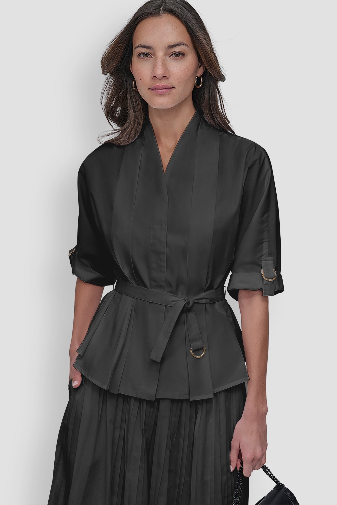 استمتعي بالأناقة الكلاسيكية مع بلوزة بأكمام قصيرة وطيات وياقة على شكل حرف Vمن دكني باللون الأسود. تعد هذه القطعة الأنيقة مثالية لموسم العطلات، وتتميز بطيات دقيقة وتصميم جذاب، وتتوافق بسهولة مع خزانة الملابس غير الرسمية والاحتفالية. قطعة أساسية لا غنى عنها في خزانة الملابس.