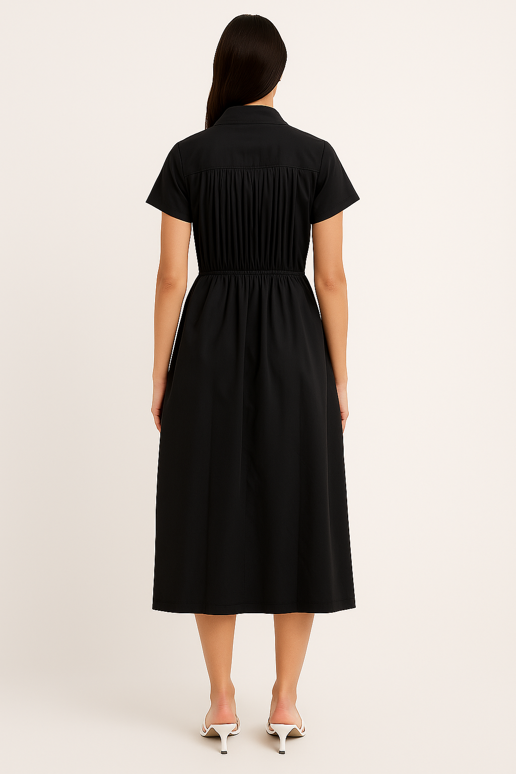 حسّني خزانة ملابسكِ مع فستان DKNY BTN DOWN A-LINE لربيع وصيف 2020. تجمع هذه القطعة السوداء الأنيقة بين الرقي والراحة، بتصميم كلاسيكي مثالي لأي مناسبة. متعدد الاستخدامات وأنيق، يتحول بسهولة من إطلالة رسمية إلى سهرة.