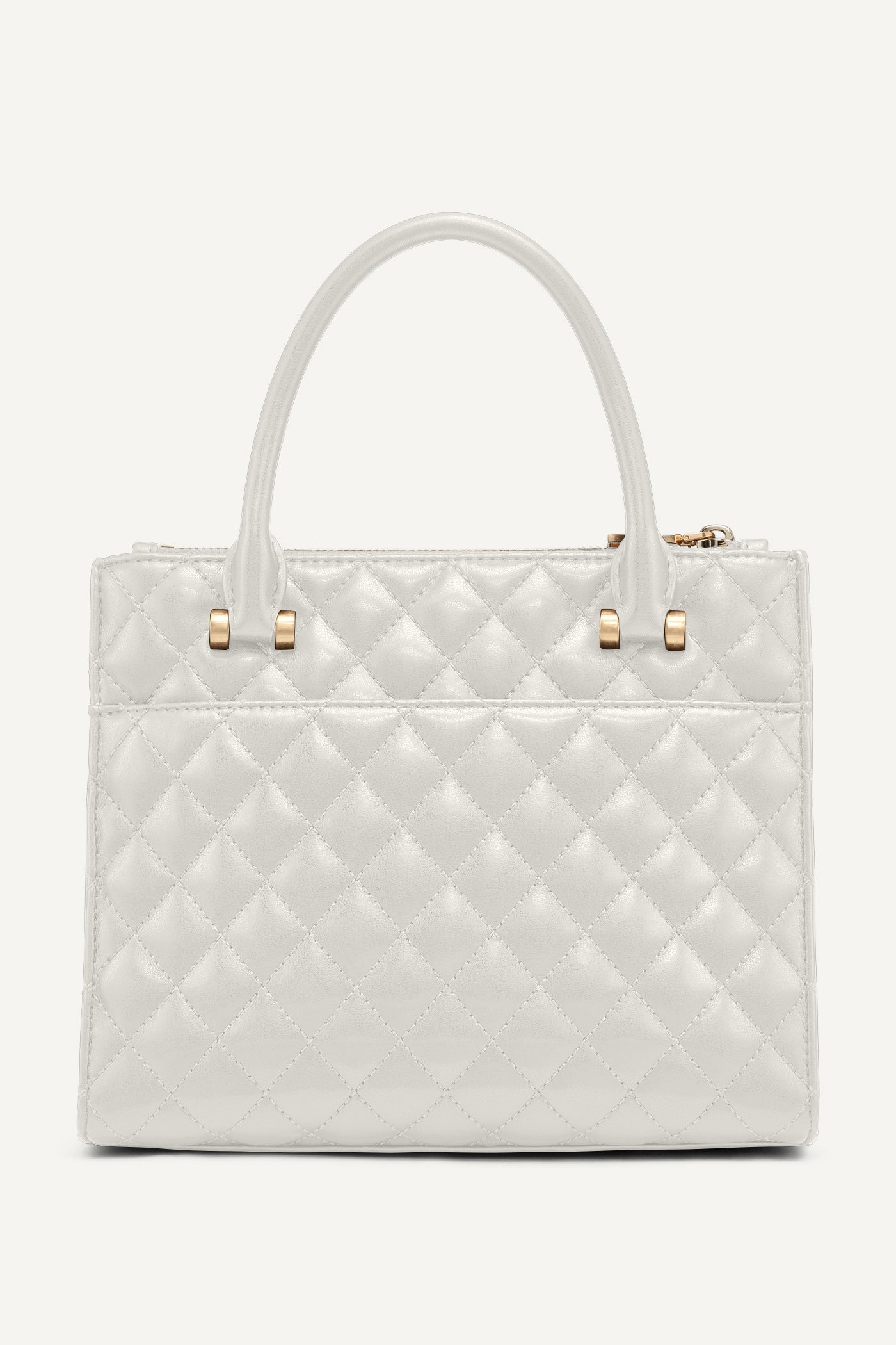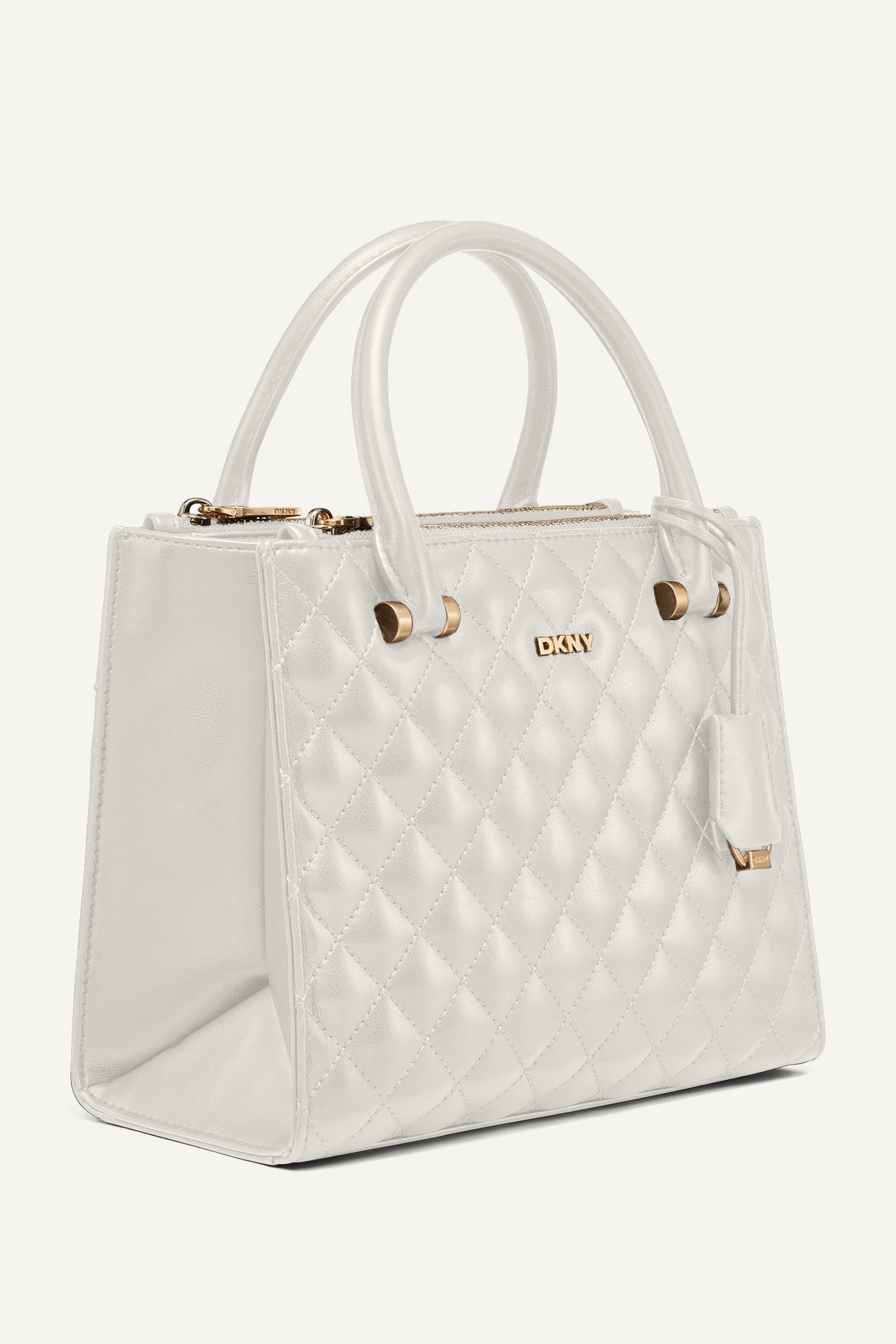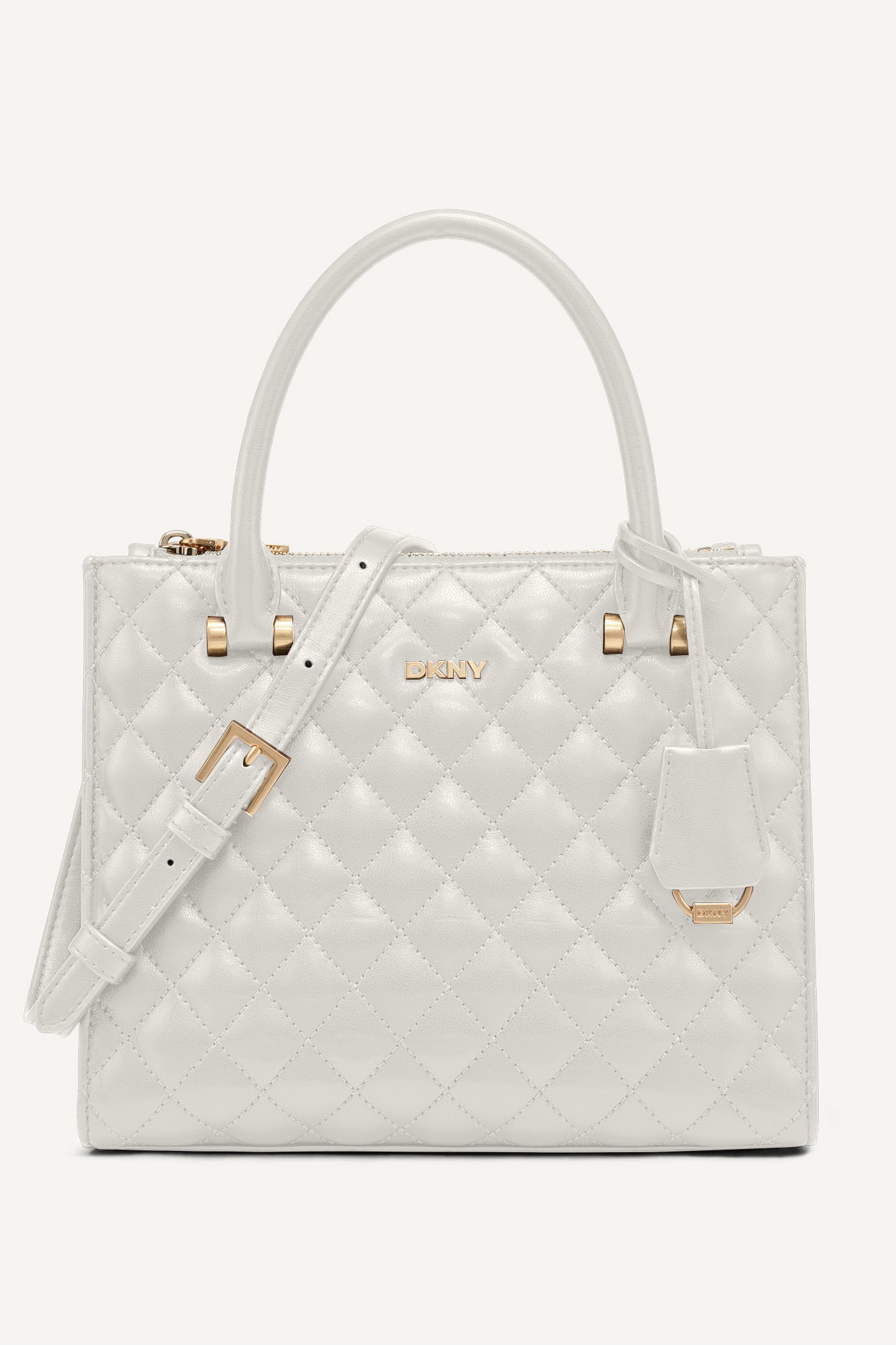 ارتقِ بإطلالتك مع حقيبة دكني ترينا ساتشيل متوسطة الحجم باللون الأبيض الكلاسيكي. تتميز هذه الحقيبة بمقابض علوية أنيقة، وتصميم أنيق، وأجزاء معدنية ذهبية اللون، حيث تمزج هذه الحقيبة الرائعة بين الرقي والعملية اليومية، وهي مثالية لحملها بكل سهولة وراحة من الصباح إلى المساء.