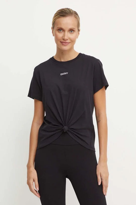ارتقِ بأناقتك الرياضية مع تي شيرت بأكمام قصيرة وياقة مستديرة مع شعار الماركة الصغير المرصع بمسامير وعقدة أمامية باللون الأسود الكلاسيكي من دكني. تتميز هذه القطعة الأساسية لخريف 2024 بلمسات أنيقة من المسامير الصغيرة المرصعة وتصميم عصري بعقدة أمامية، وتعد مثالية لخزانة ملابسك الحيوية والعصرية.