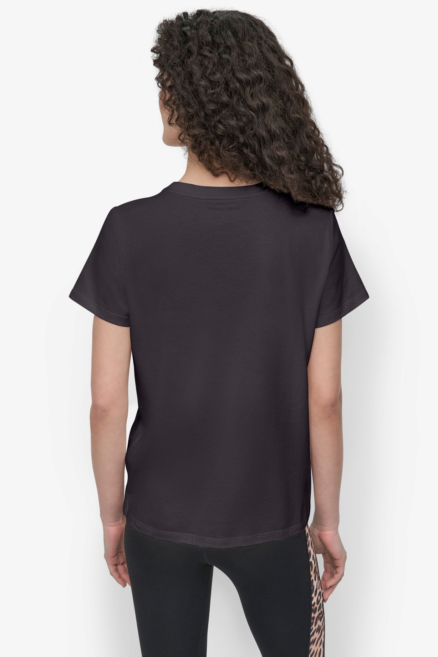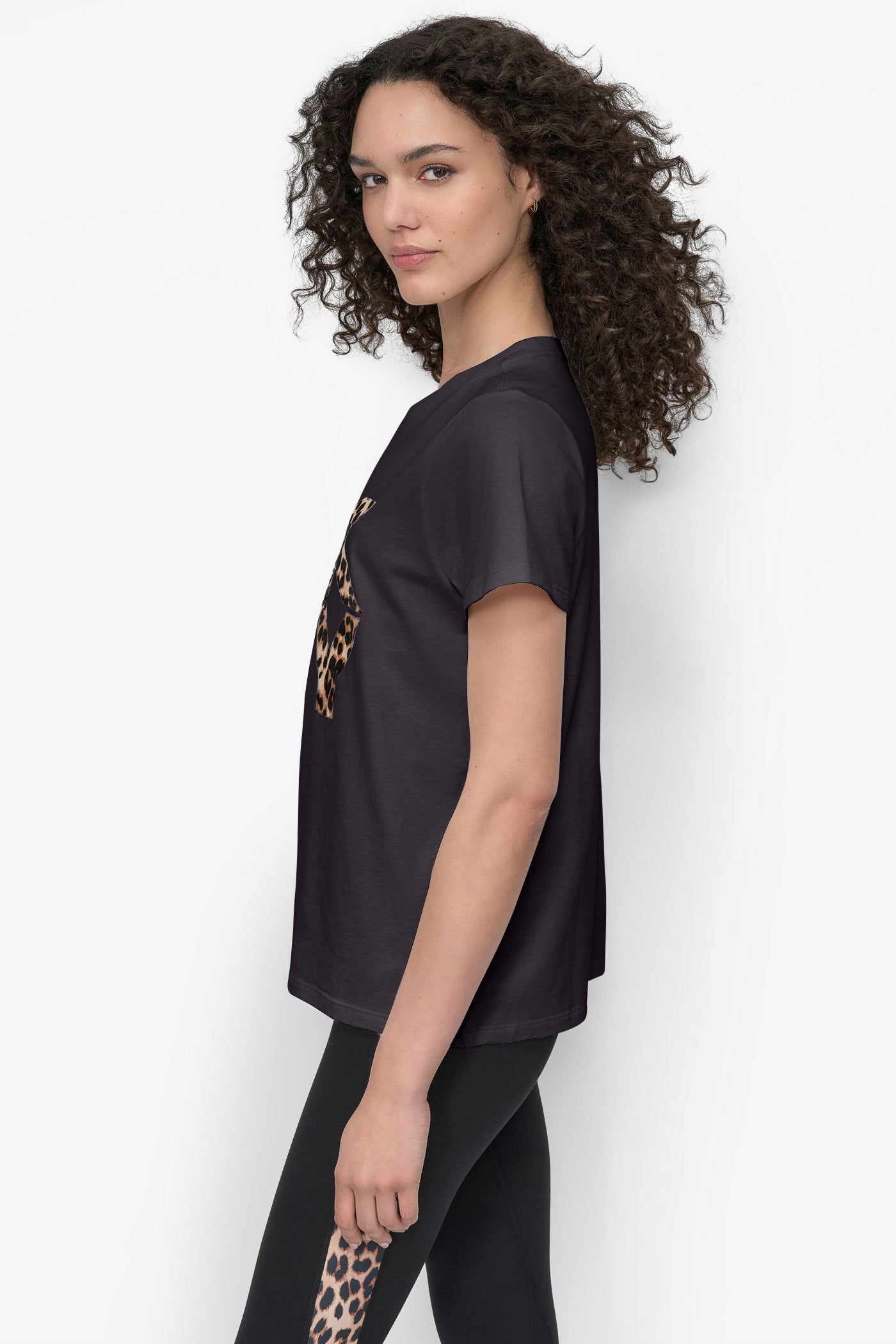 عززي أناقة أغراضك الأساسية مع هذا التي شيرت الأسود بأكمام قصيرة وقصة مريحة من العلامة التجارية الشهيرة دكني. تم تصميم هذا التي شيرت ليمنحكِ أناقة وراحة لا مثيل لهما، كما أن تصميمه الرائع يتناسب تمامًا مع أي قطعة ملابس في خزانتكِ، مما يجعله قطعة أساسية لا غنى عنها في كل مجموعة ملابس عصرية.