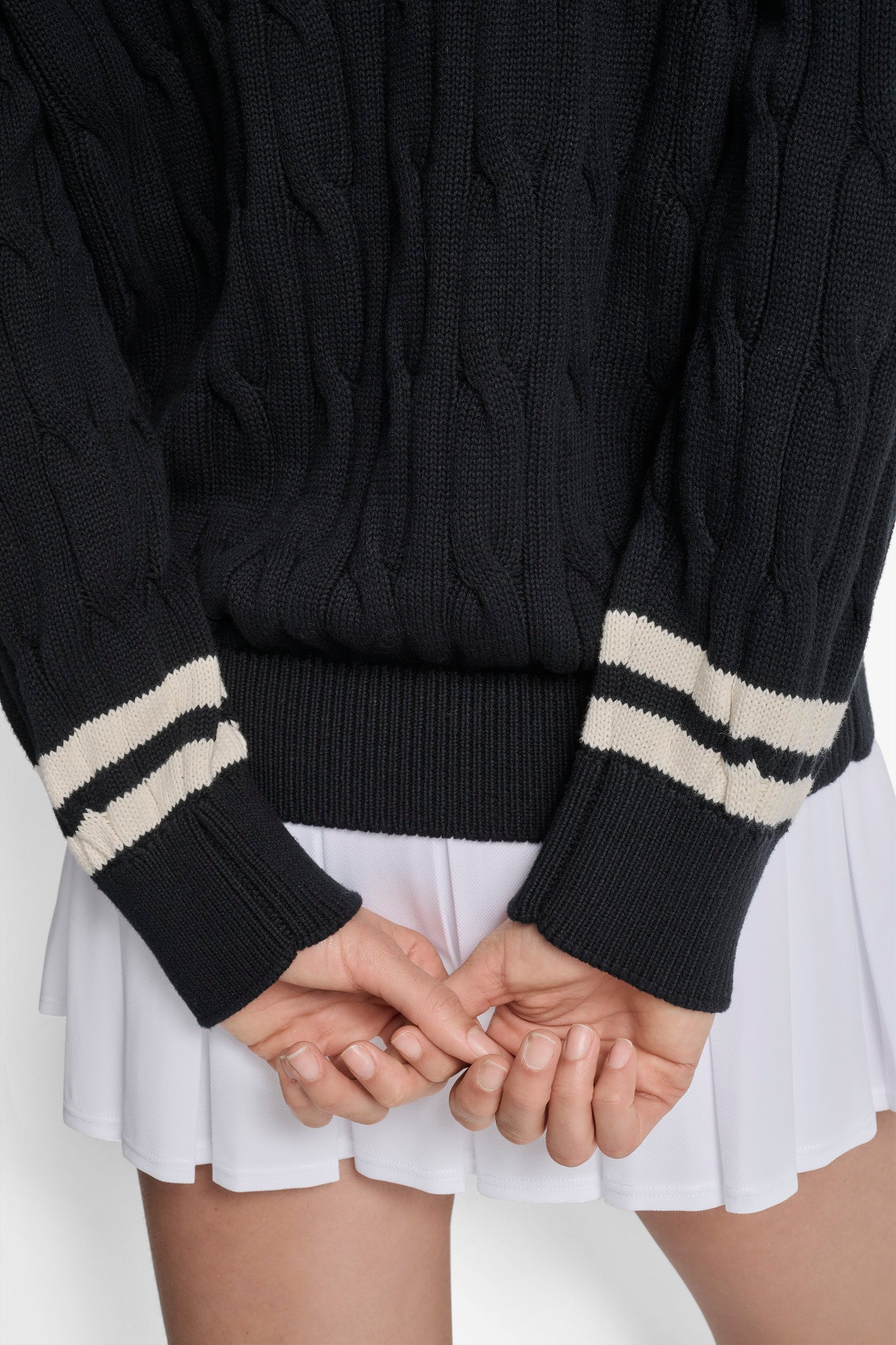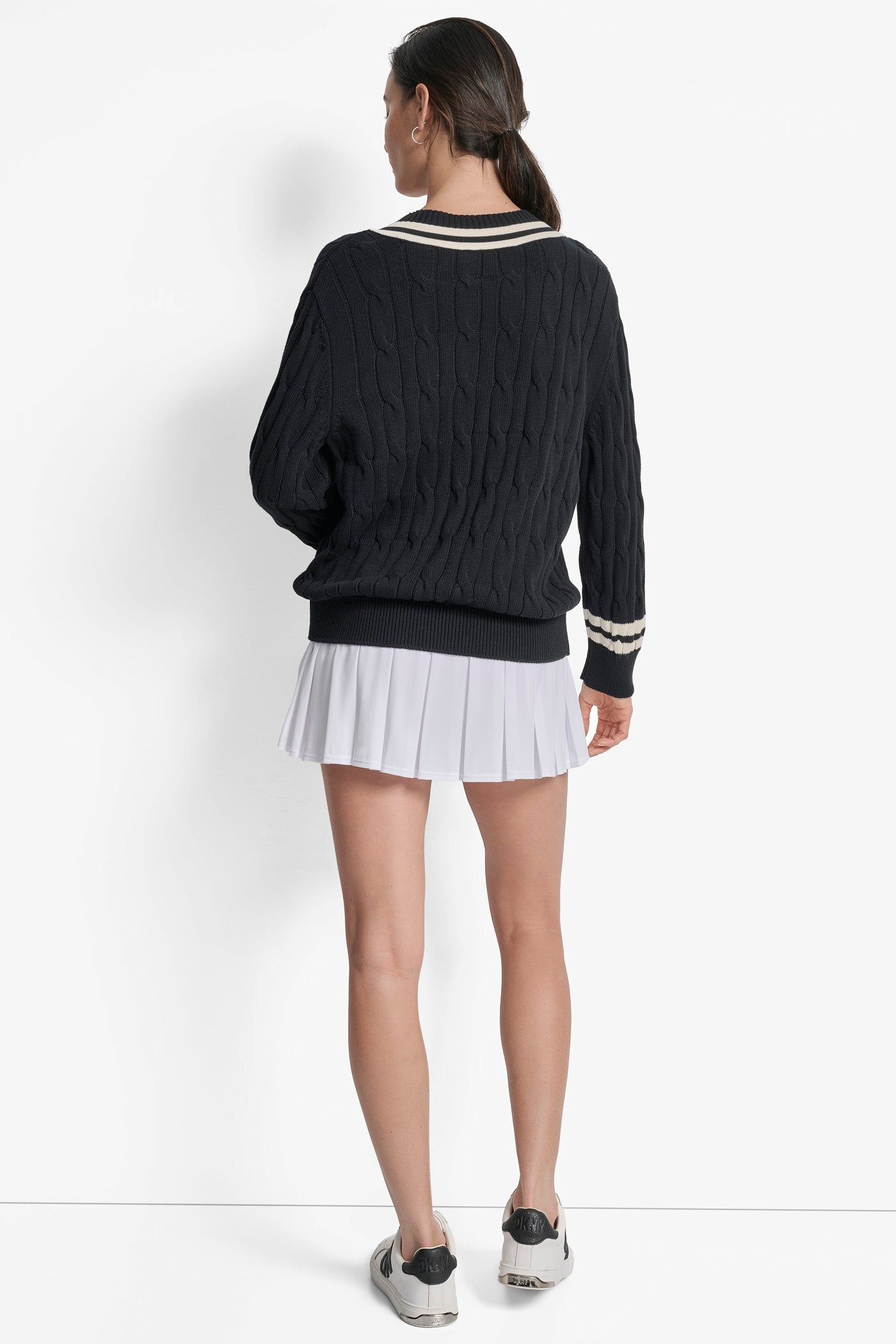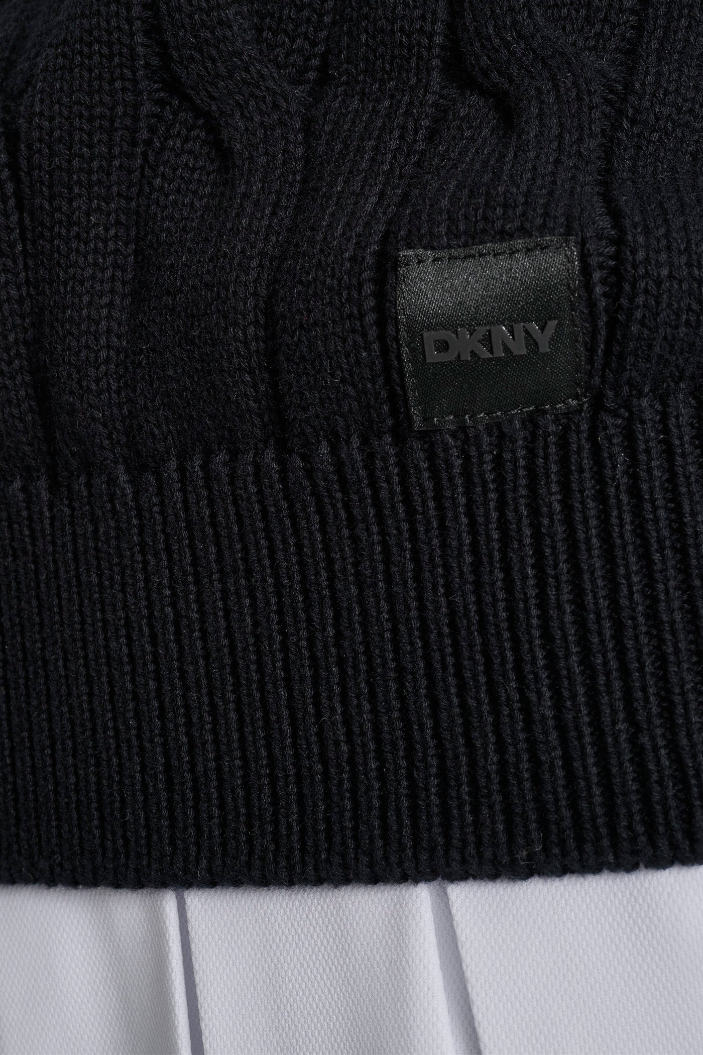 Elevate your wardrobe with this DKNY Cable Long Sleeve Sweater in classic black. The intricate cable knit design offers timeless style and cozy comfort, making it the perfect versatile top for layering or wearing alone during cooler seasons.