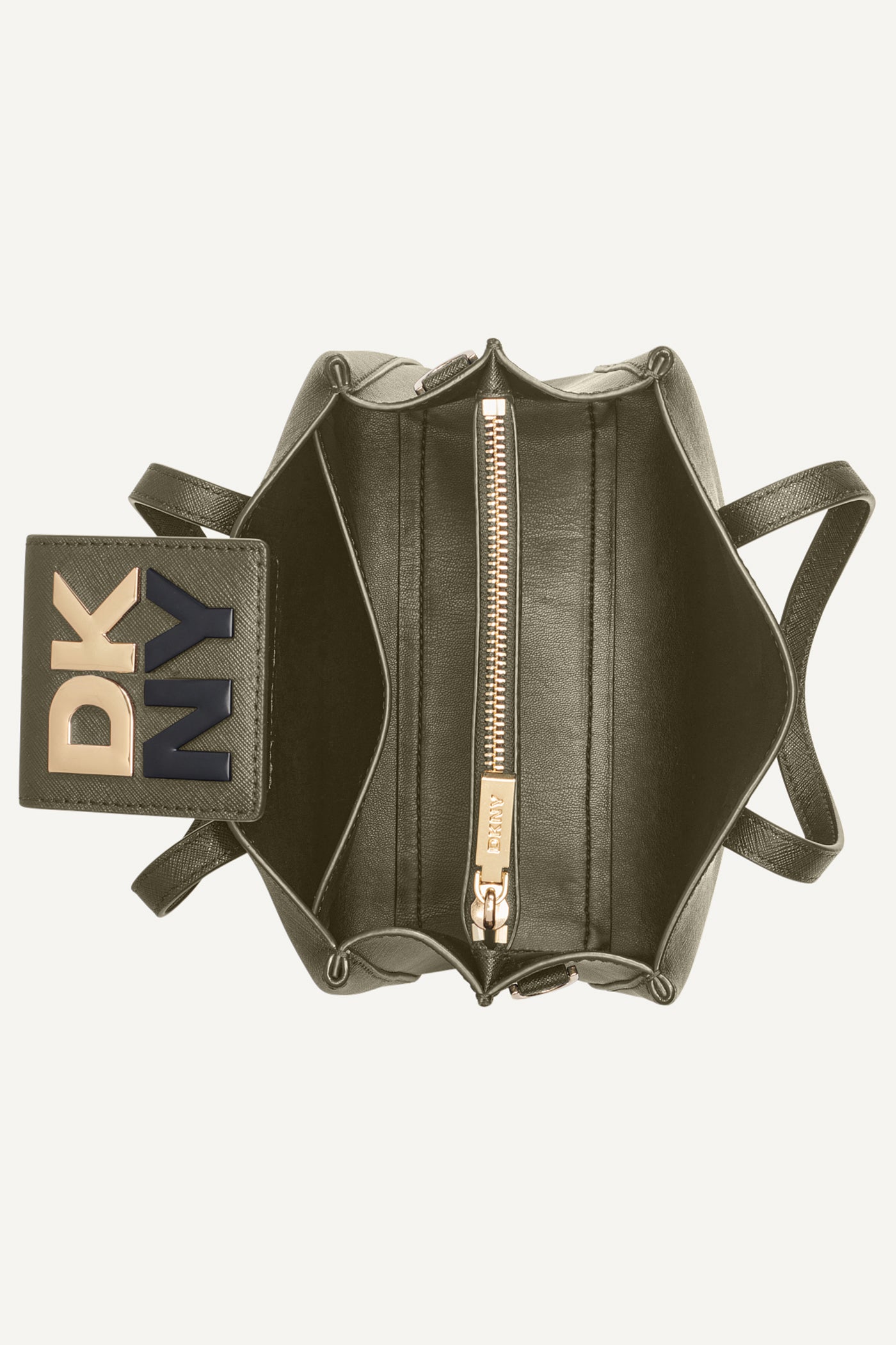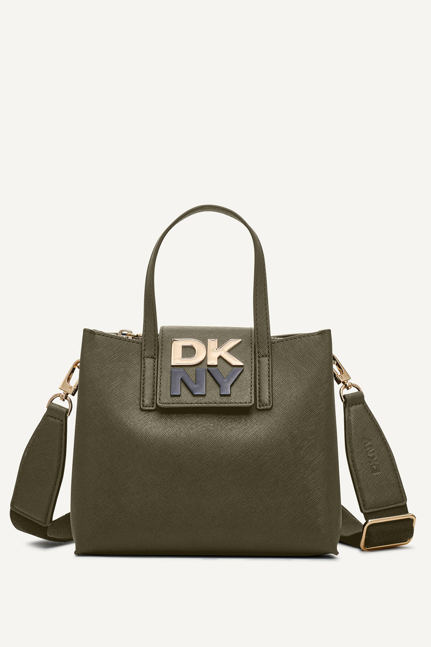 Make a bold style statement with the DKNY FAYE SMALL SATCHEL. This accessory features a prominent metallic logo plate, combining luxury and functionality. Perfect for elevating casual or dressy looks with effortless sophistication and contemporary edge.