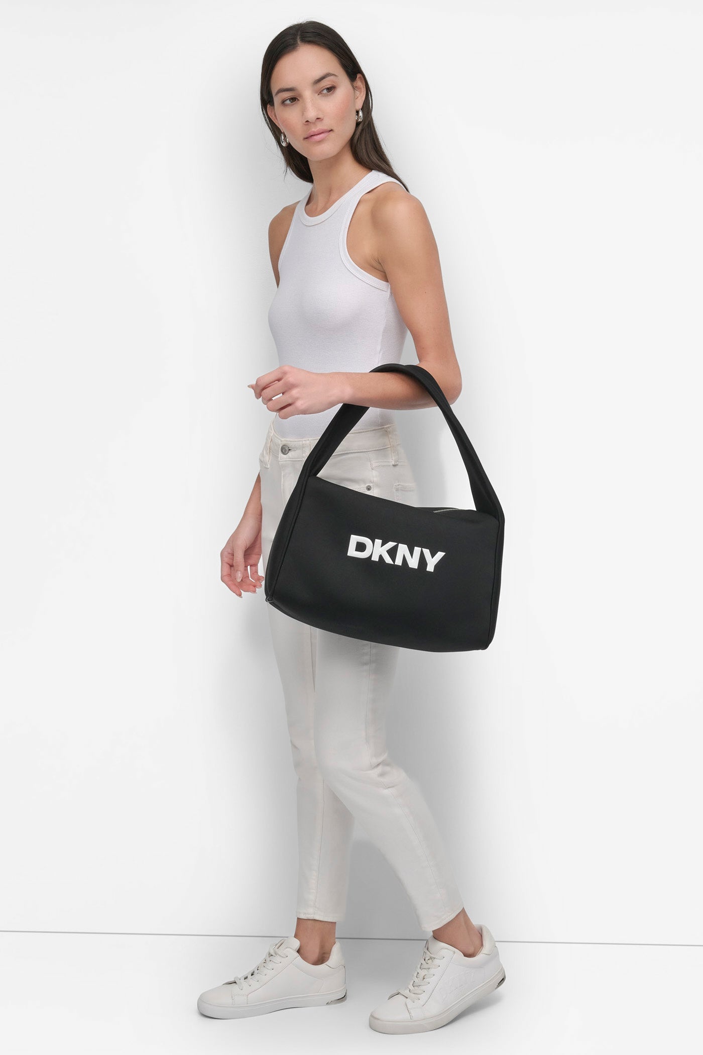 Elevate your style with the Jenny Medium Hobo by DKNY. Sophisticated and timeless in classic black, this versatile bag combines elegance with practicality. Perfect for everyday use, it seamlessly complements any outfit, providing ample space without compromising chicness.