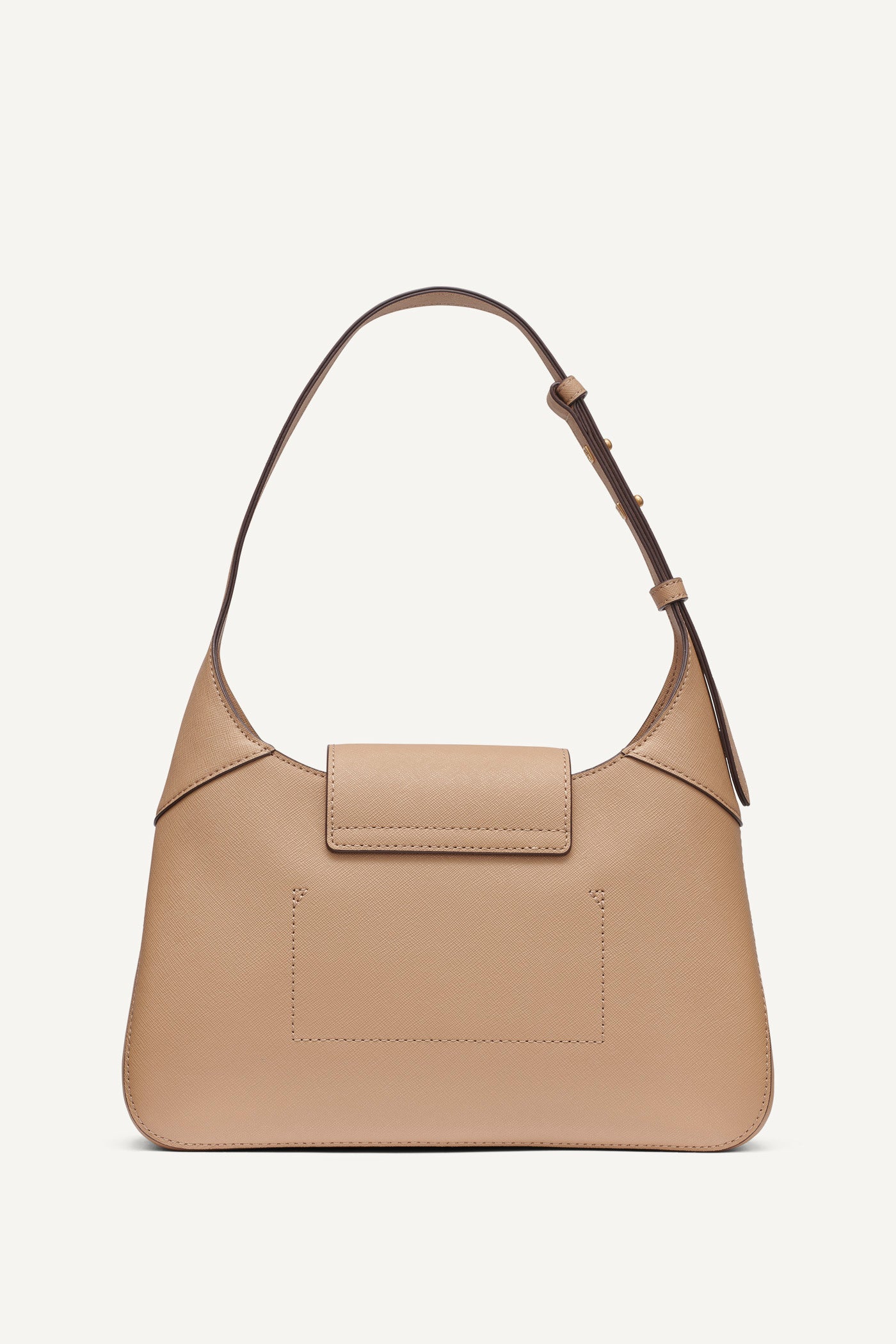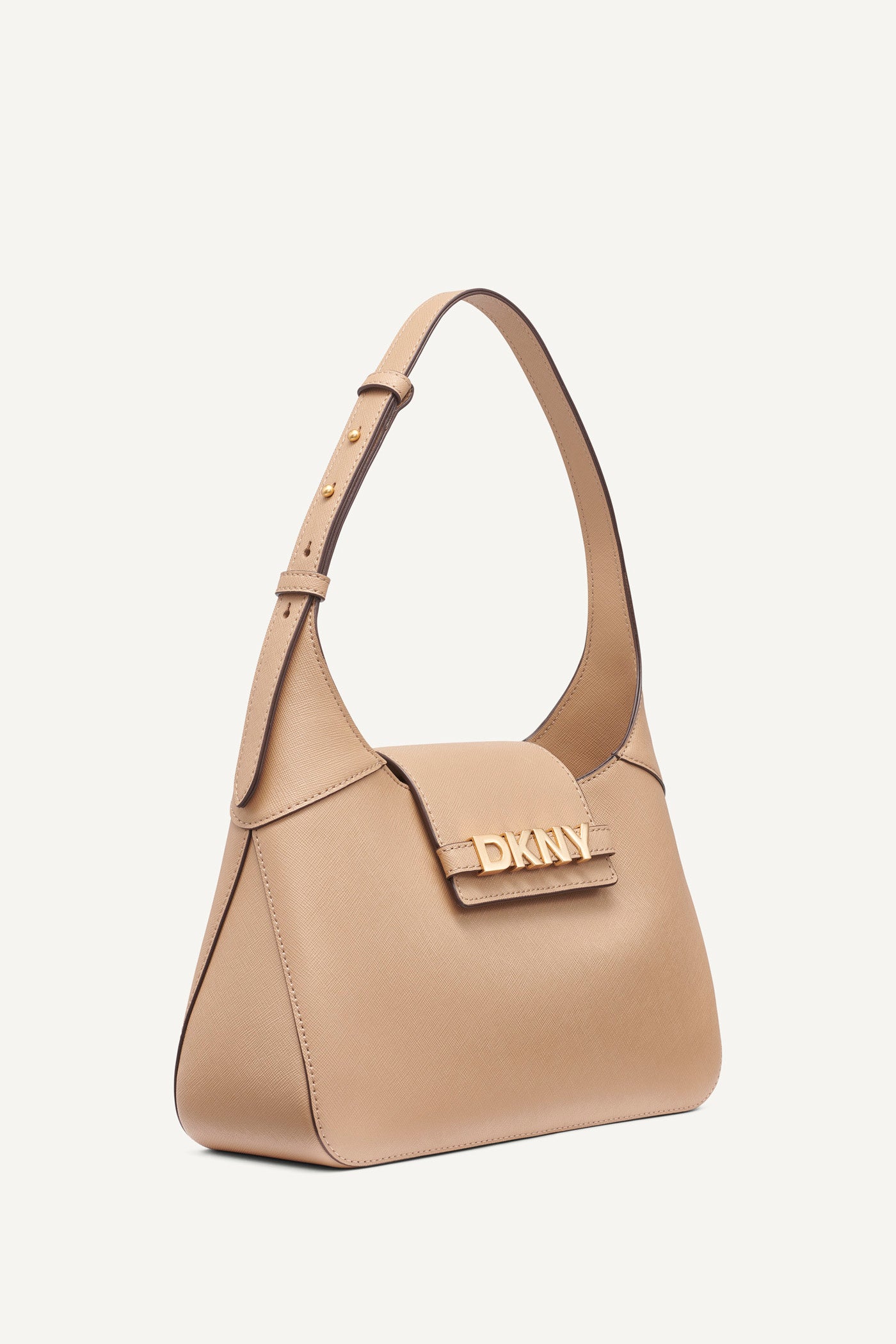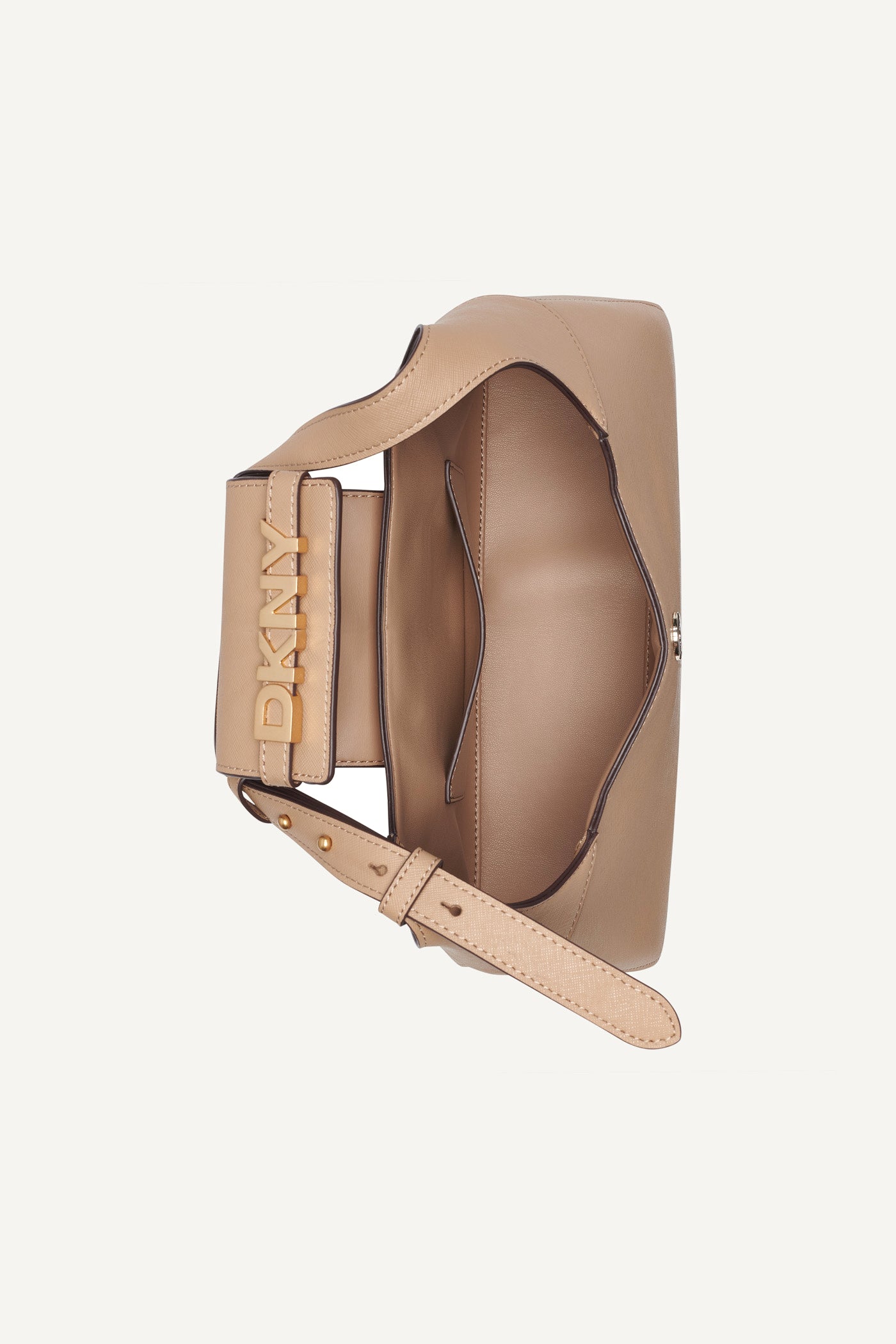 Chic and versatile, the DKNY Avril Shoulder Bag in beige complements any outfit. Its sleek silhouette and spacious interior offer everyday practicality, while the subtle branding and gold-toned accents add an elegant touch. Perfect for both work and casual outings.
