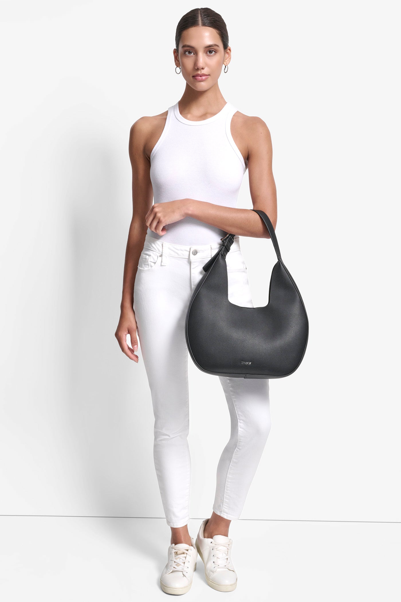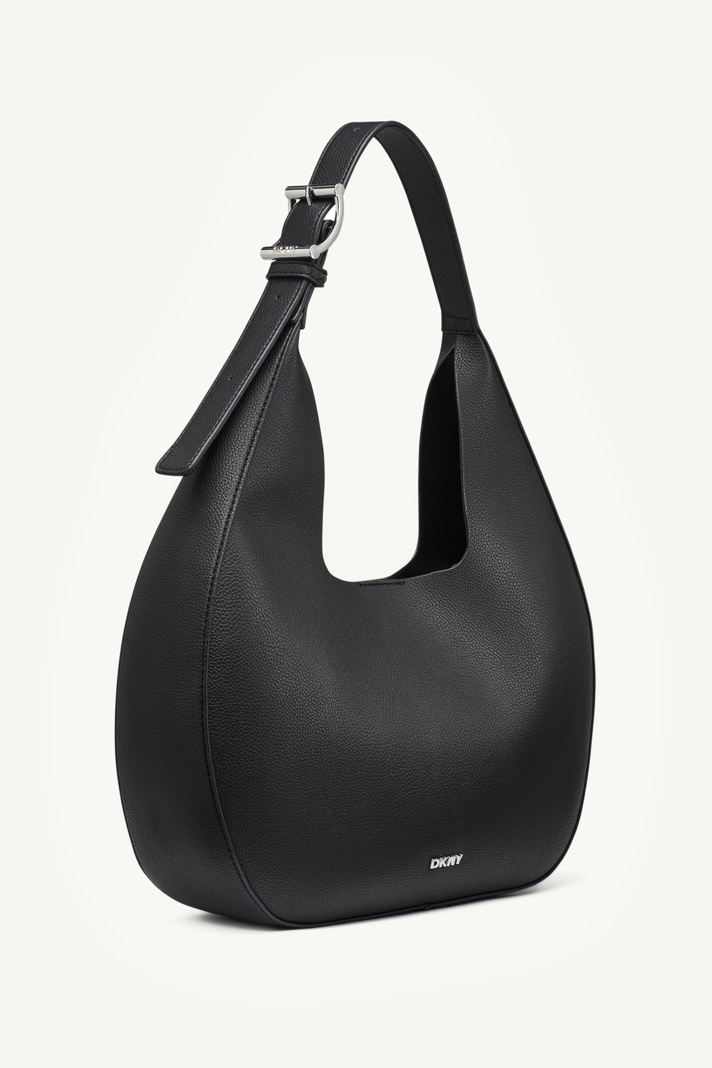 Elevate your everyday style with the DKNY CAMILA Medium Hobo in classic black. This versatile shoulder bag features a spacious interior, sleek silhouette, and comfortable strap, blending practical design with sophisticated city-chic flair perfect for day-to-night transitions.