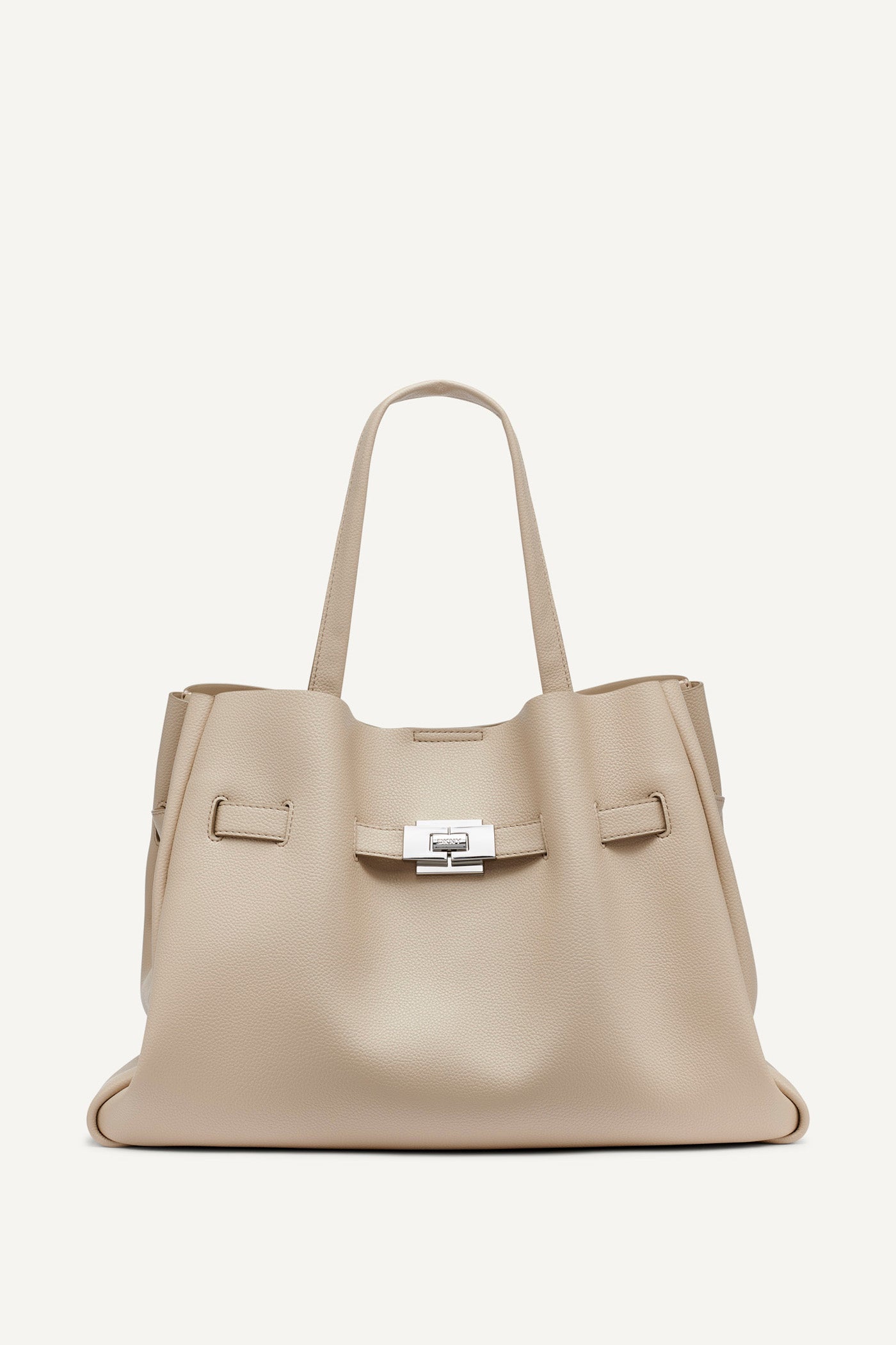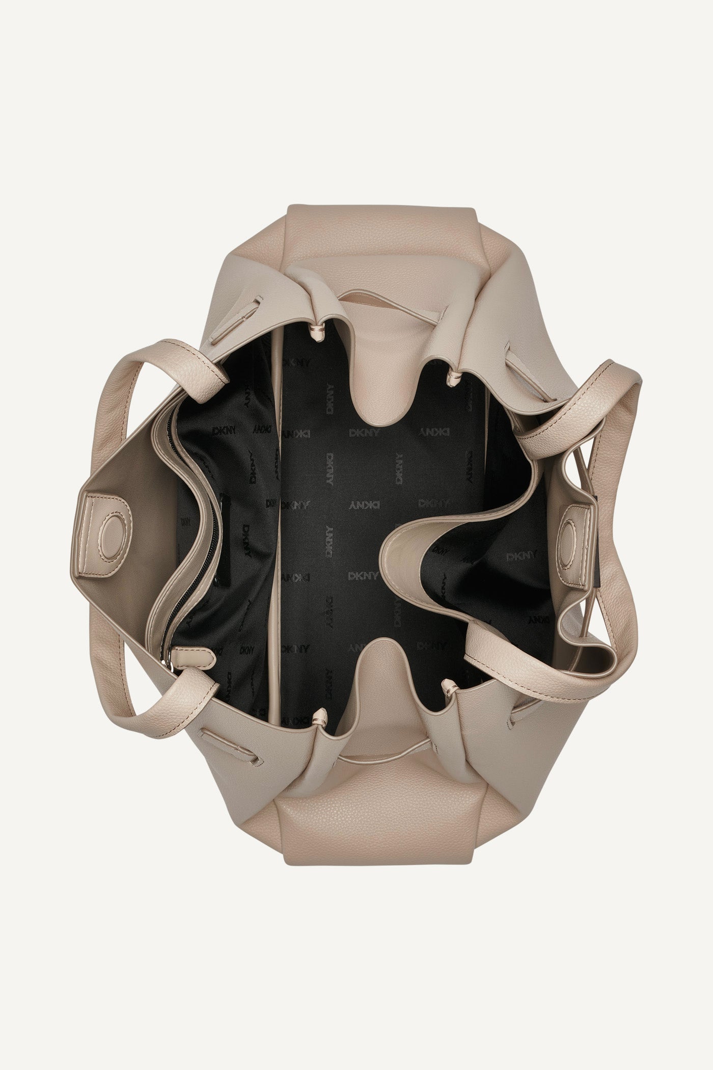 Elevate your everyday style with the DKNY Bryar Large Satchel in classic beige. Crafted from durable 100% polyurethane, this top handle bag features a spacious interior and sleek lines, blending sophistication and practicality for a versatile, chic accessory. Item ID: R52DAK43LT3