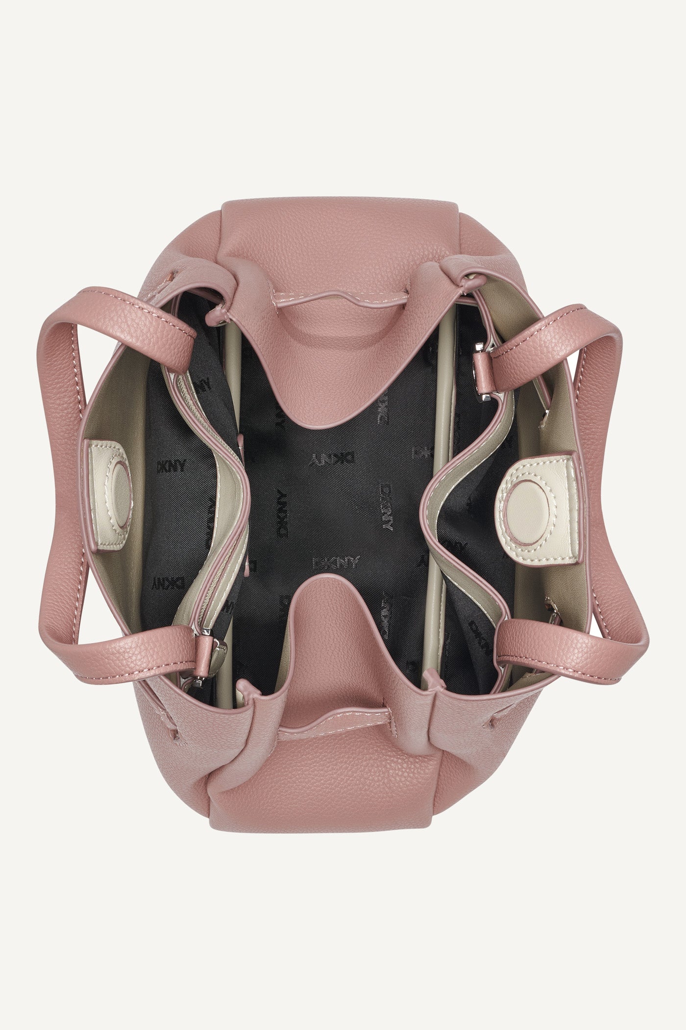 Add a pop of color to your look with the DKNY Bryar Small Satchel in vibrant pink. This top handle bag features a structured silhouette, gold-tone hardware, and a detachable strap, offering both style and versatility for everyday chic.
