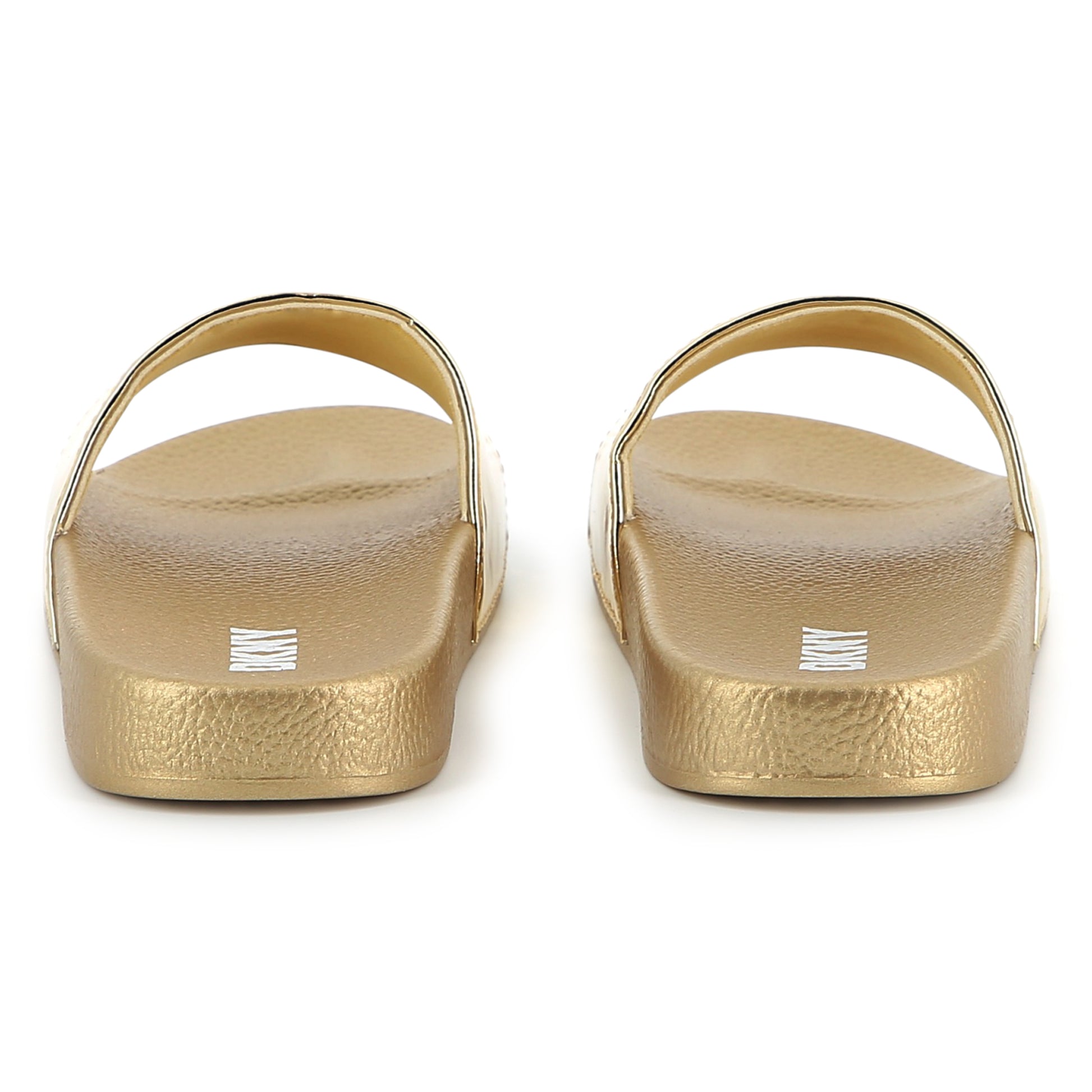 Elevate casual comfort with the AQUA SLIDES in a refined gold tone by DKNY. Designed for girls, these slides blend stylish simplicity with classic branding, making them ideal for versatile wear. Their durable construction ensures lasting support, perfect for everyday use in warm weather.