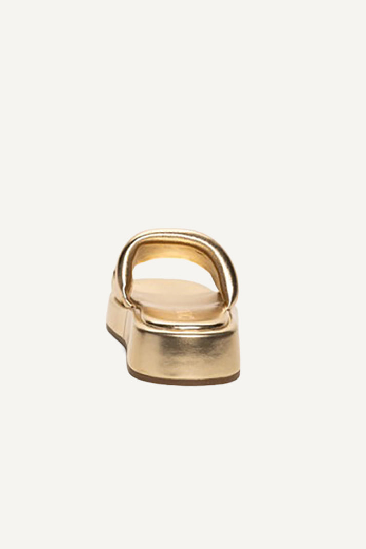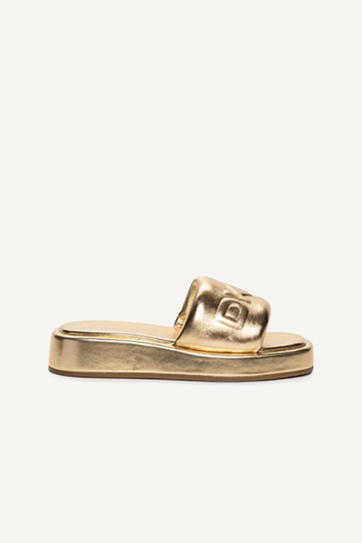 Step into effortless chic with the DKNY LOJA Platform Slide in stunning gold. Boasting a modern silhouette and comfortable design, these shoes add a touch of glamour to any ensemble. Perfect for elevating your casual or evening look.