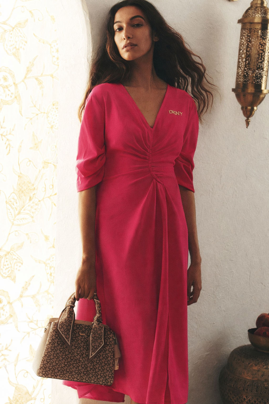 Experience effortless elegance with the DKNY 3/4 Raushed XLV V-Neck Dress in chic pink. Crafted from premium material, this dress features flattering ruching, a stylish v-neckline, and sophisticated three-quarter sleeves perfect for brunch dates or evening outings.