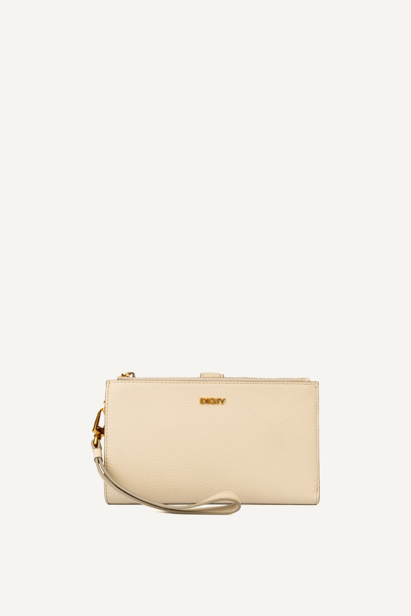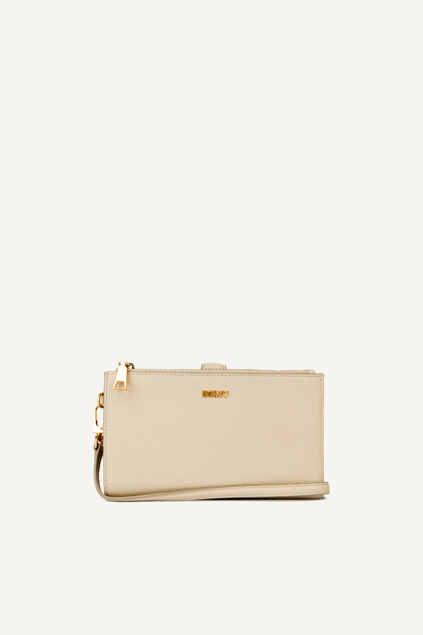 Effortlessly chic, the DKNY PAIGE WALLET ON A STRAP in light taupe combines functionality and style. Featuring multiple compartments and a detachable strap, this versatile wallet transitions easily from daytime errands to evening outings for versatile, hands-free elegance.