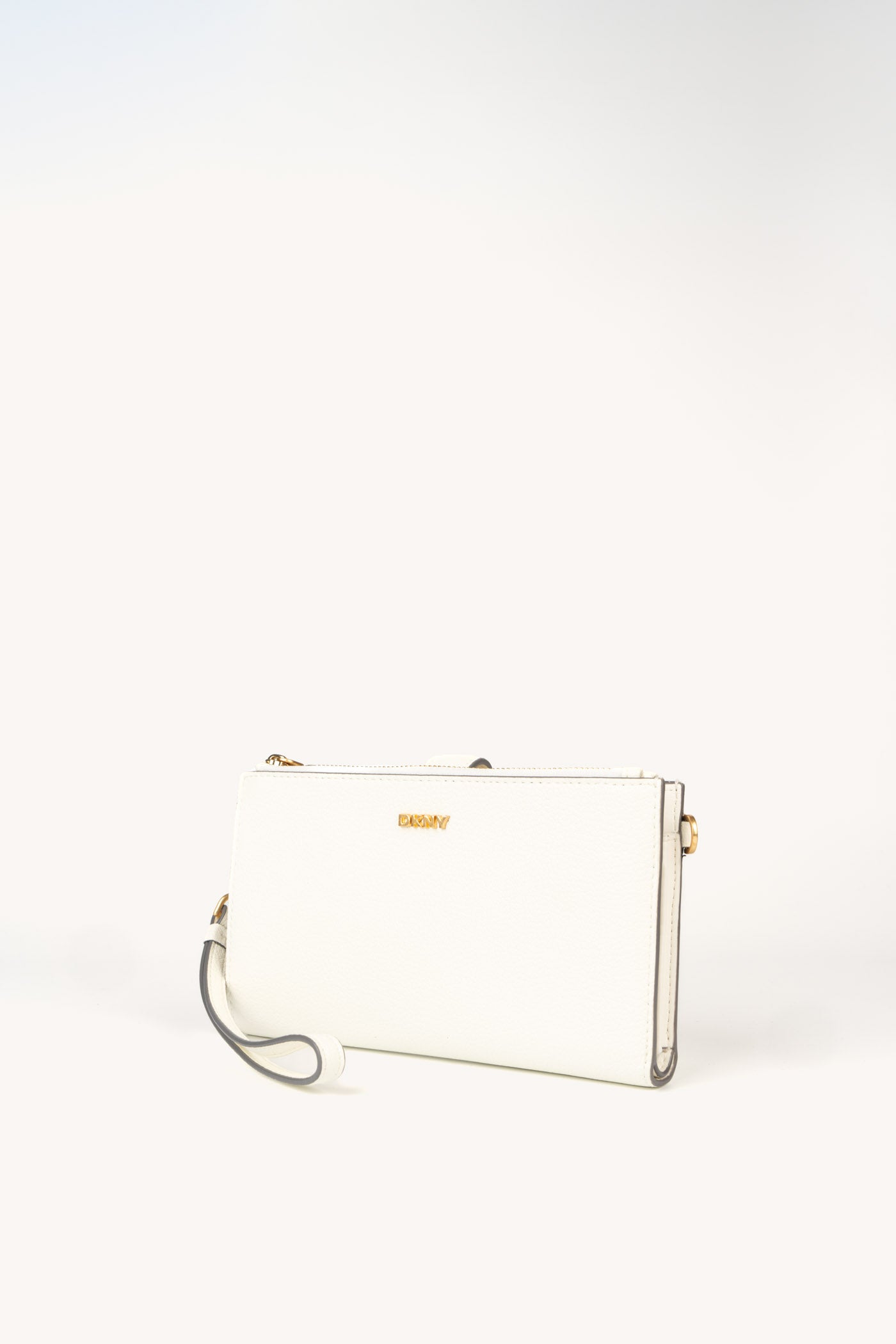 Effortlessly chic, the DKNY PAIGE WALLET ON A STRAP in Marshmallow offers stylish versatility. This sleek wallet features multiple card slots, a secure zip compartment, and an adjustable crossbody strap perfect for hands-free convenience and sophisticated, everyday organization. Item ID: R615KP26MMW