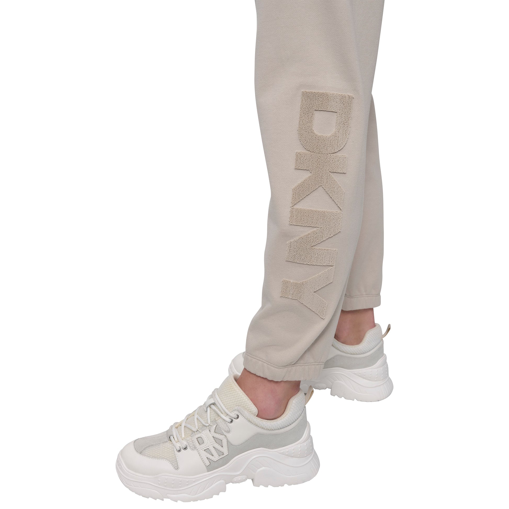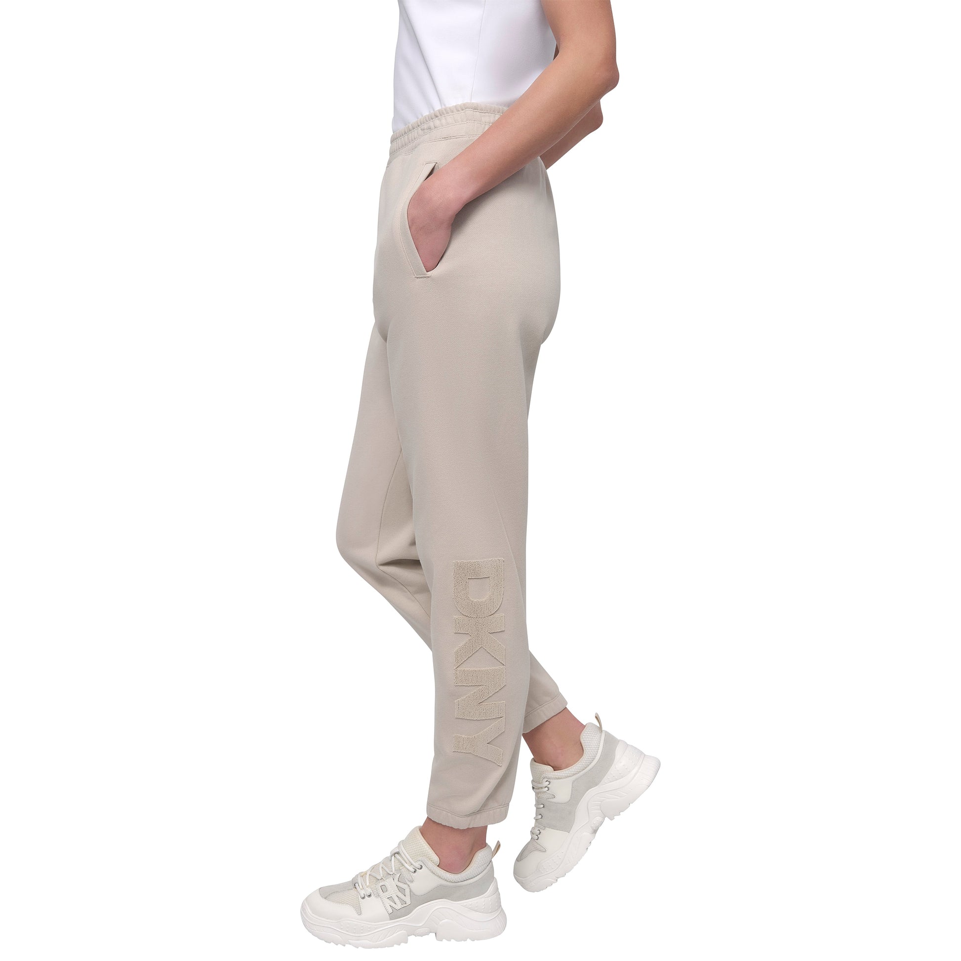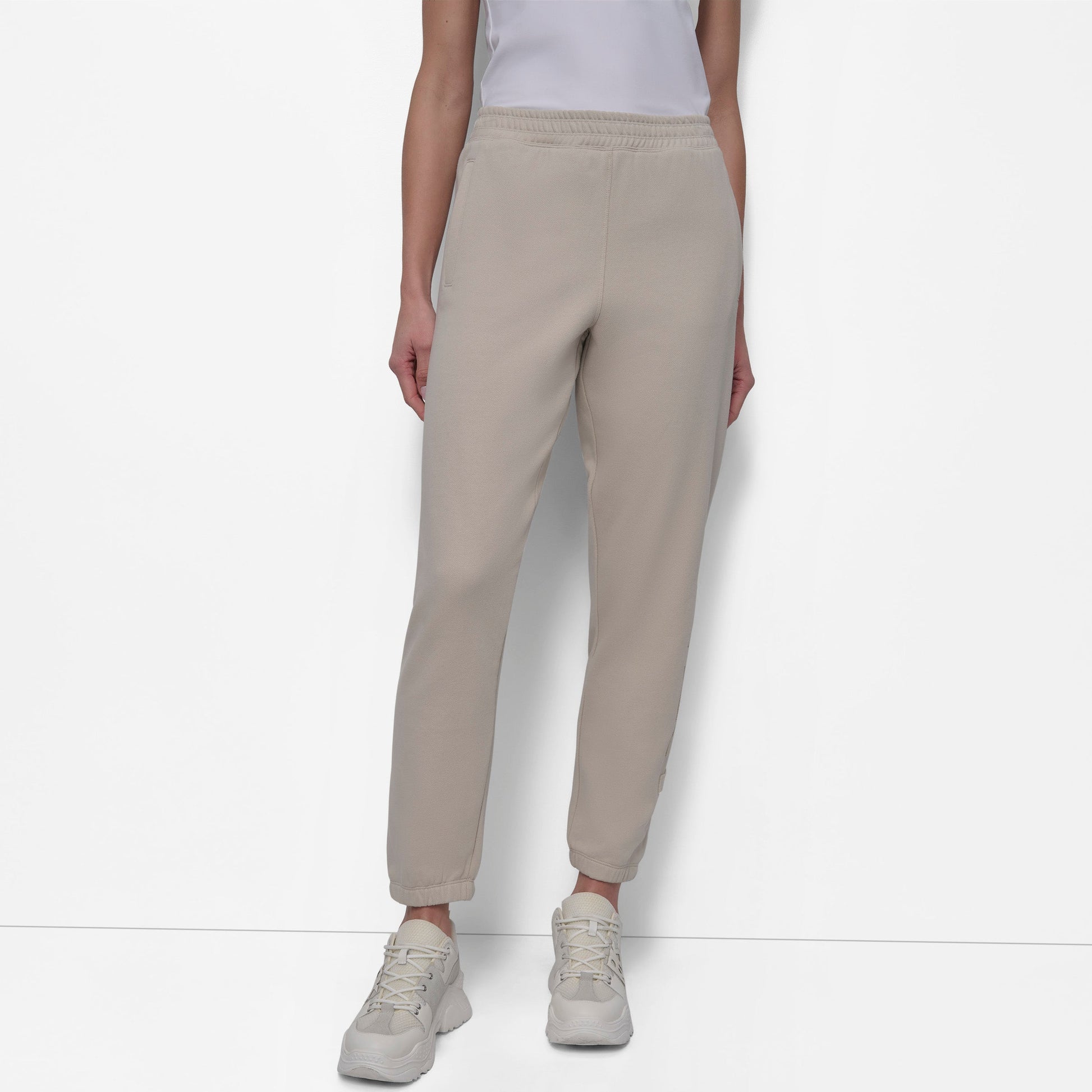 Elevate your athleisure with DKNY's EMB LG HW JOGGER in Pebble. These sleek sport joggers offer a perfect blend of comfort and style, featuring a high waist and embroidered logo detailing. Ideal for both workouts and casual outings.