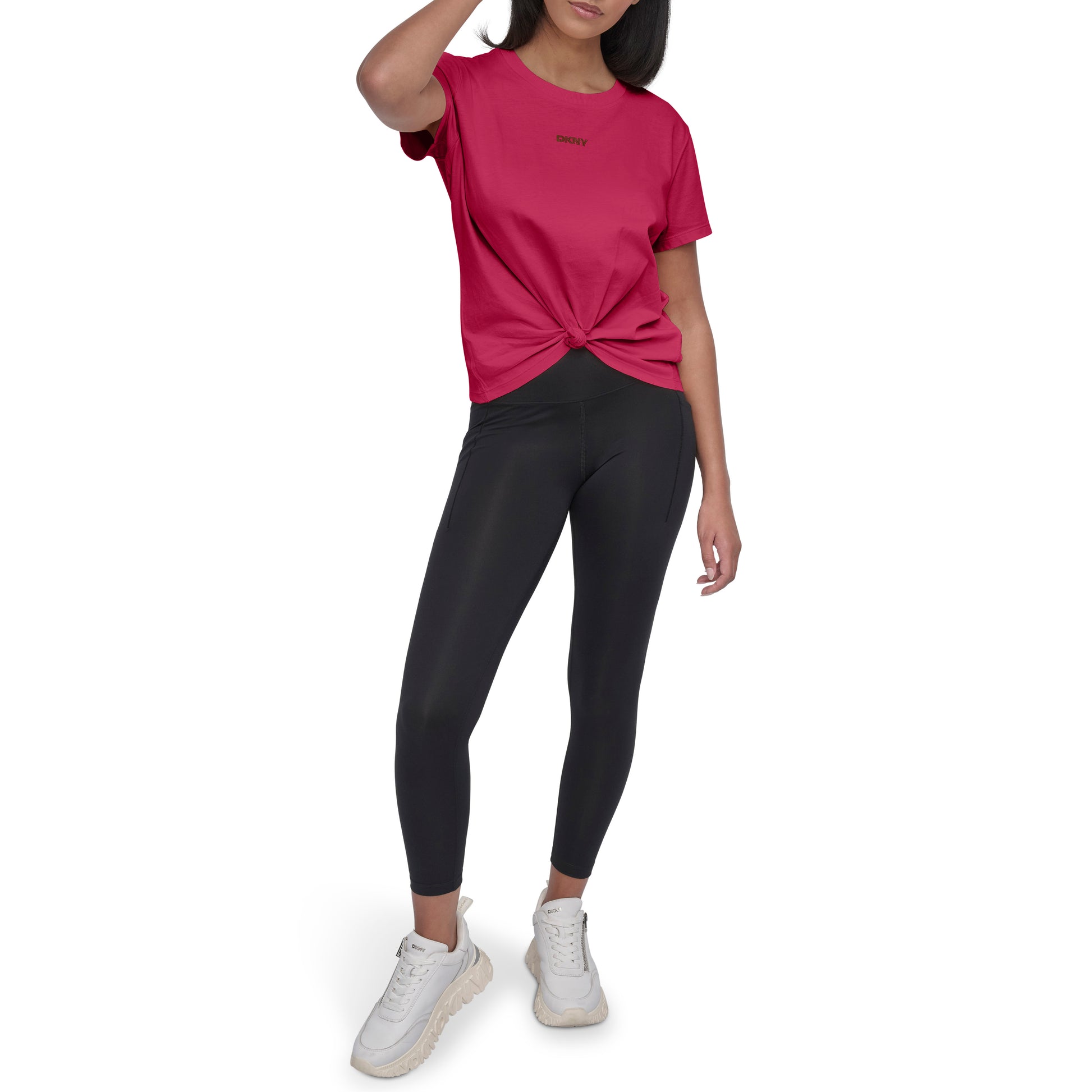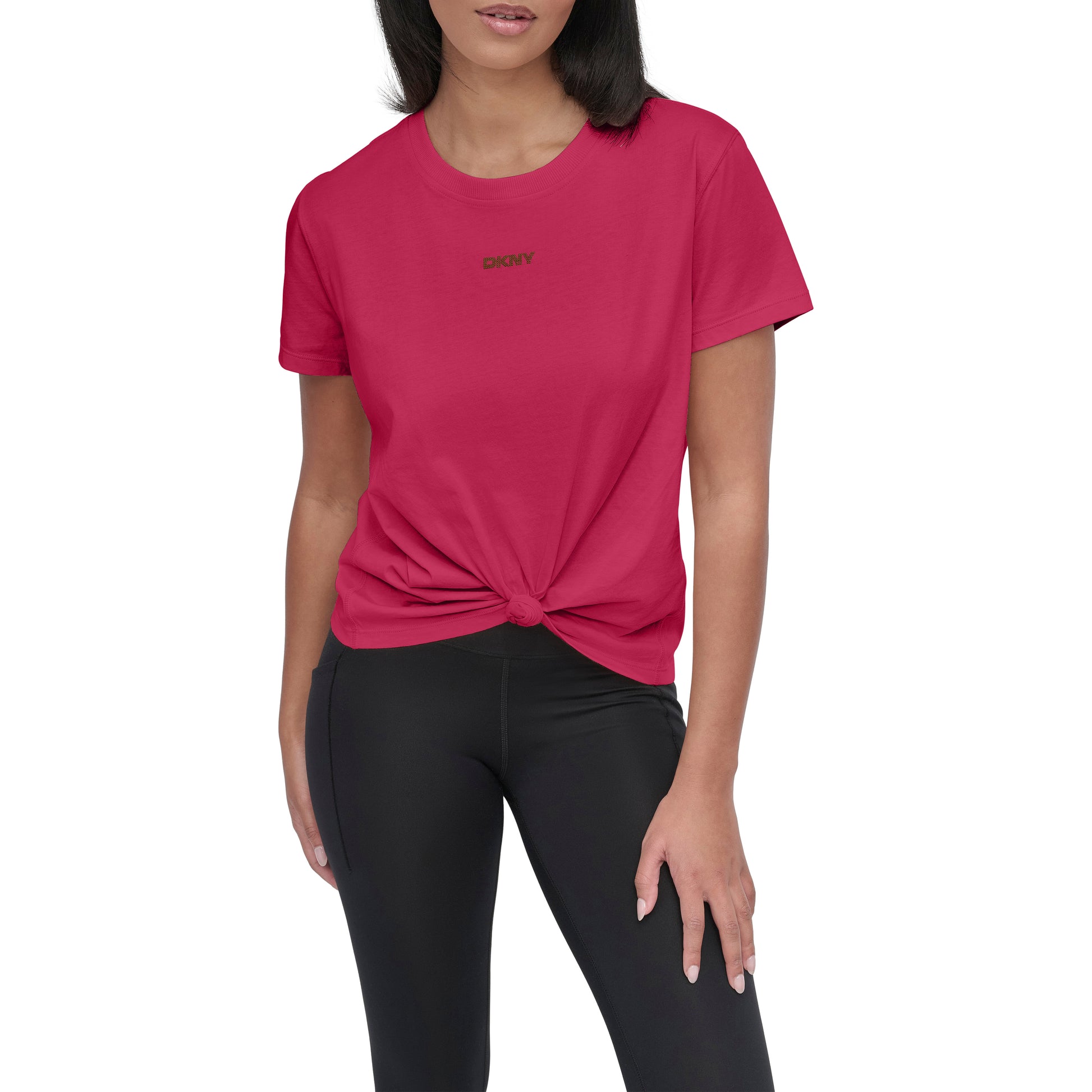 Add a touch of designer flair to your look with the DKNY Mini Stud Logo Tee in rich purple. Crafted for comfort, this soft cotton top features a subtle studded logo detail, perfect for effortless casual style or layering year-round.