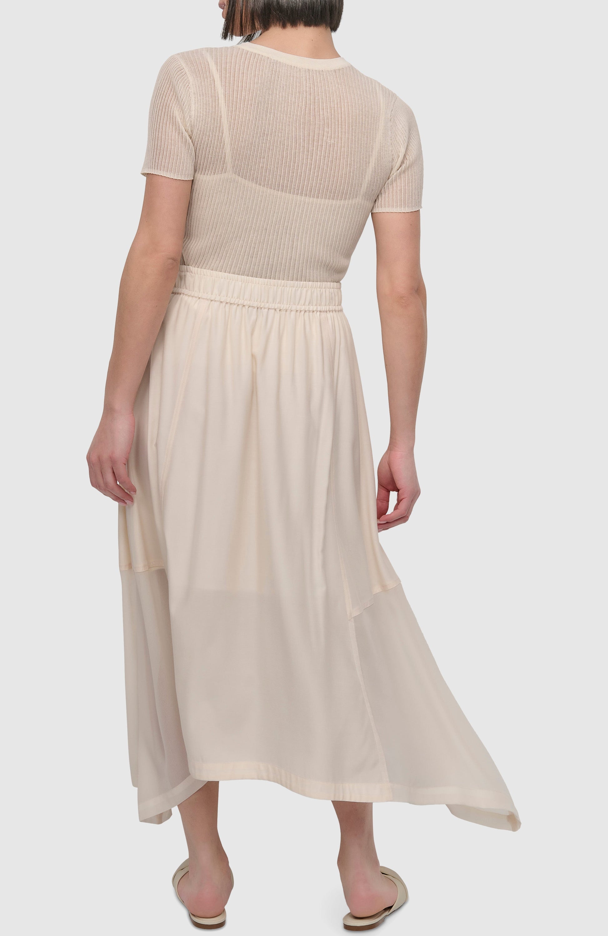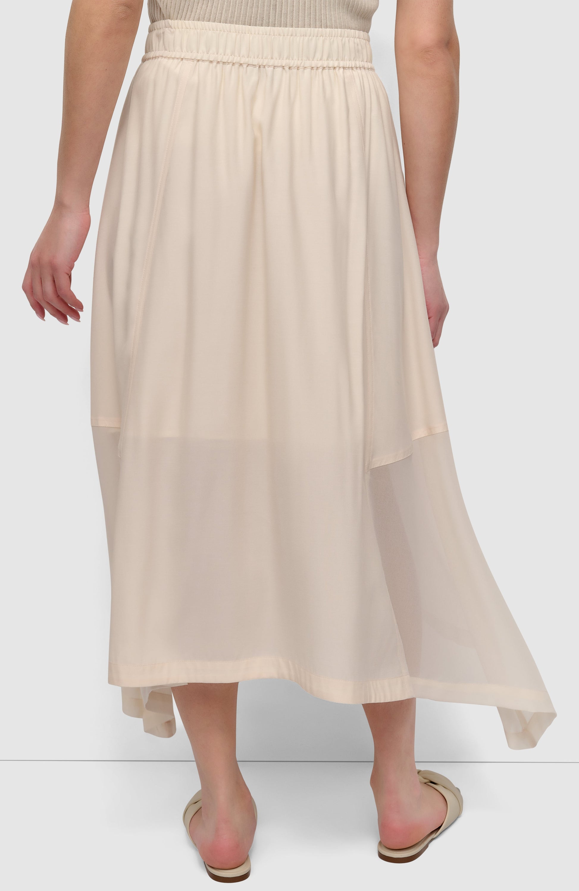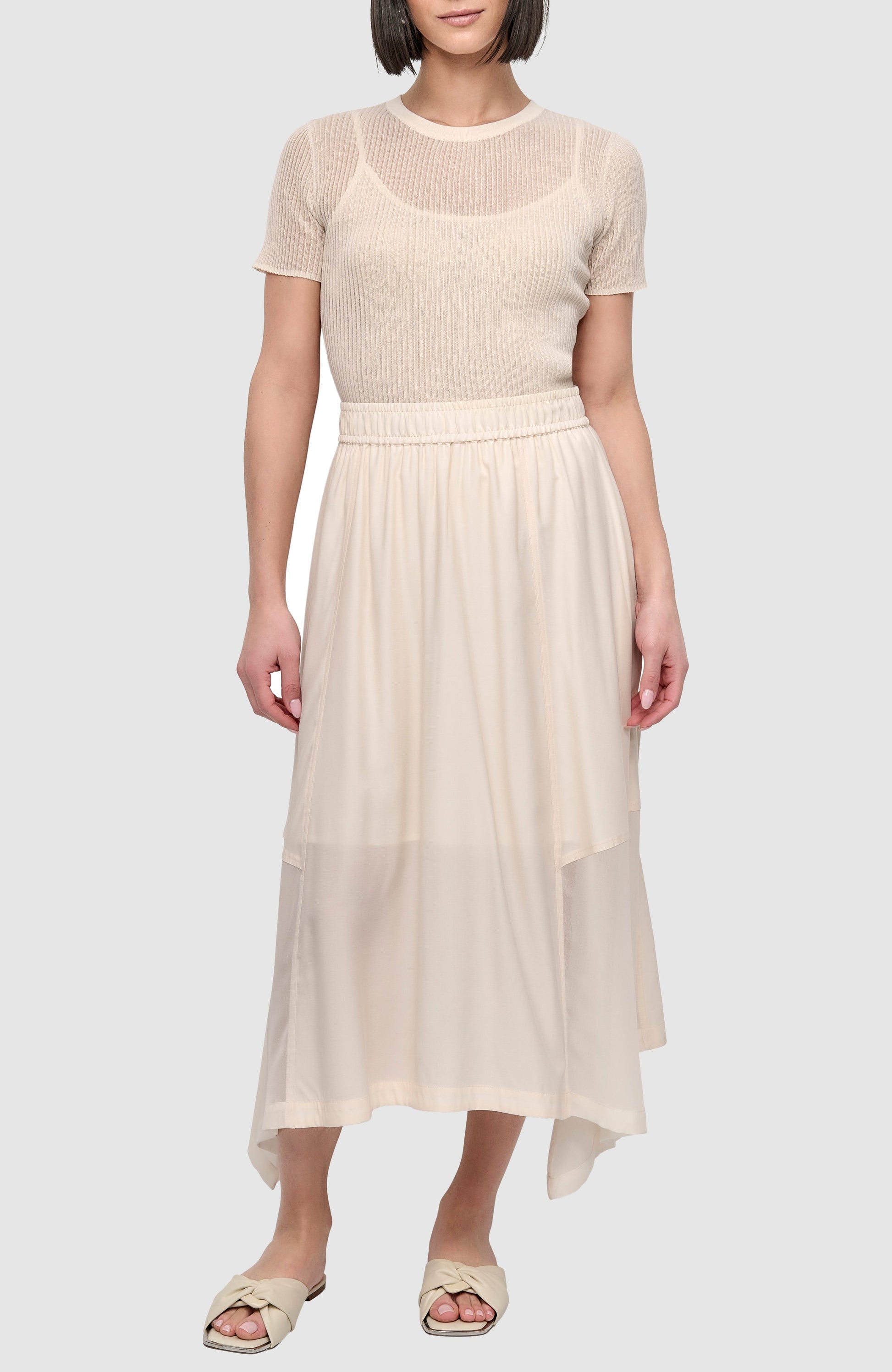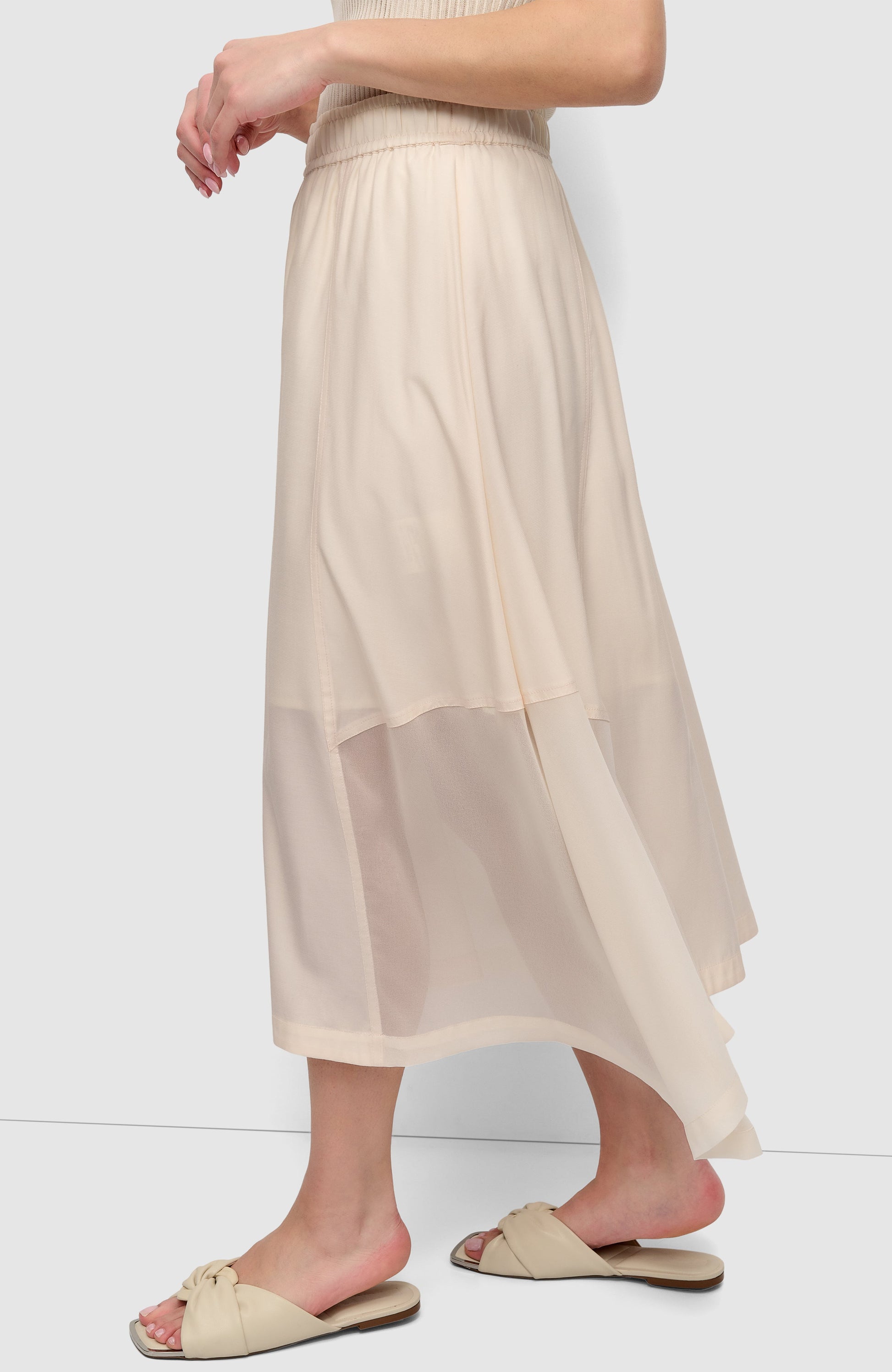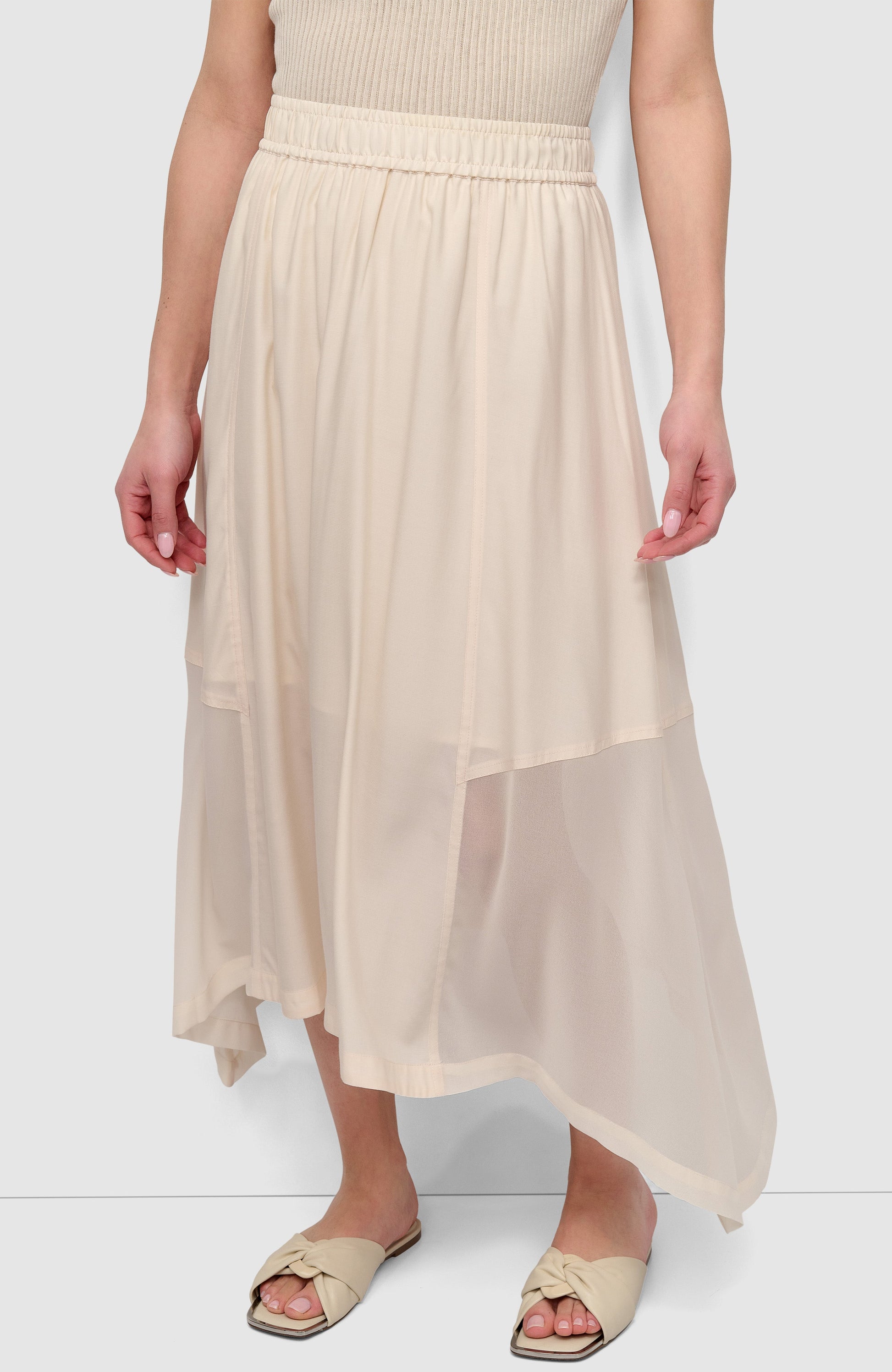 Designed for both style and comfort, this skirt offers a unique silhouette with its flowing handkerchief hem. The partial lining provides subtle coverage without compromising breathability, while the elastic waistband ensures a secure and adaptable fit. Perfect for elevating your wardrobe with a sophisticated yet effortless piece.