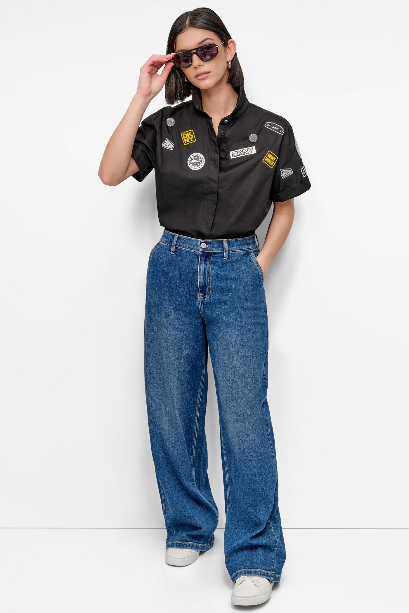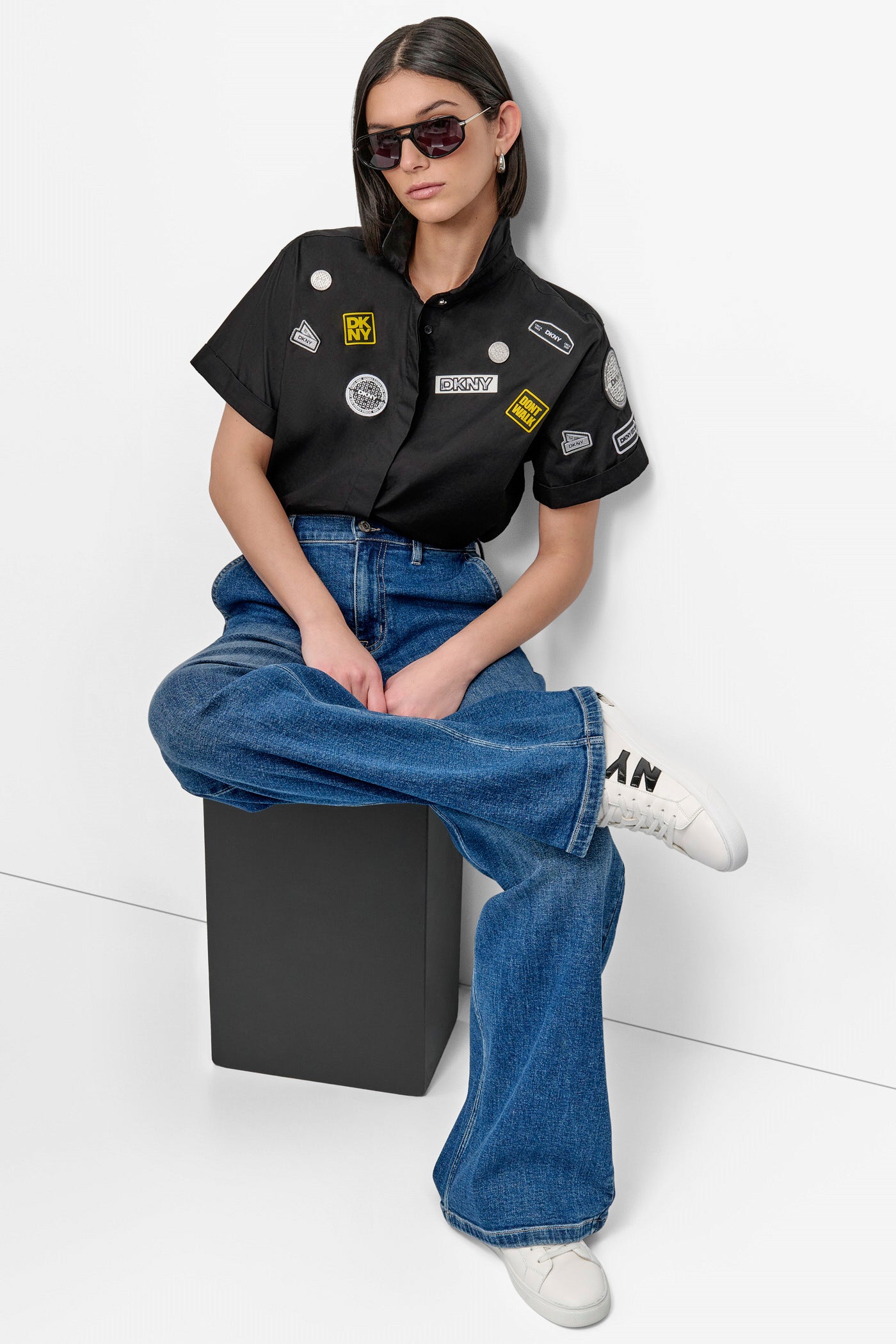 The DKNY S/S Collard Pins Tee in black delivers a modern, edgy aesthetic with its standout collar pin details. Crafted from premium cotton, this signature top offers both comfort and style-perfect for elevating any casual or semi-formal wardrobe ensemble.