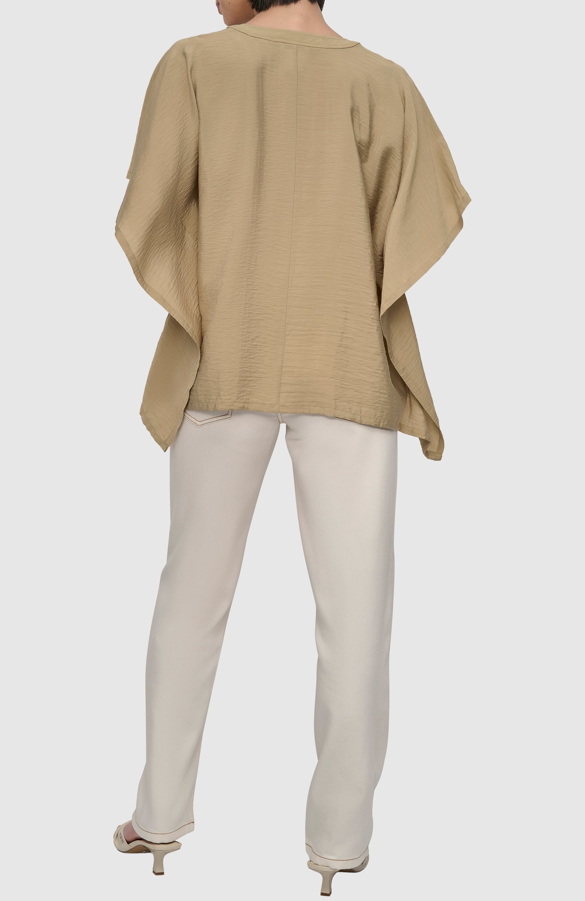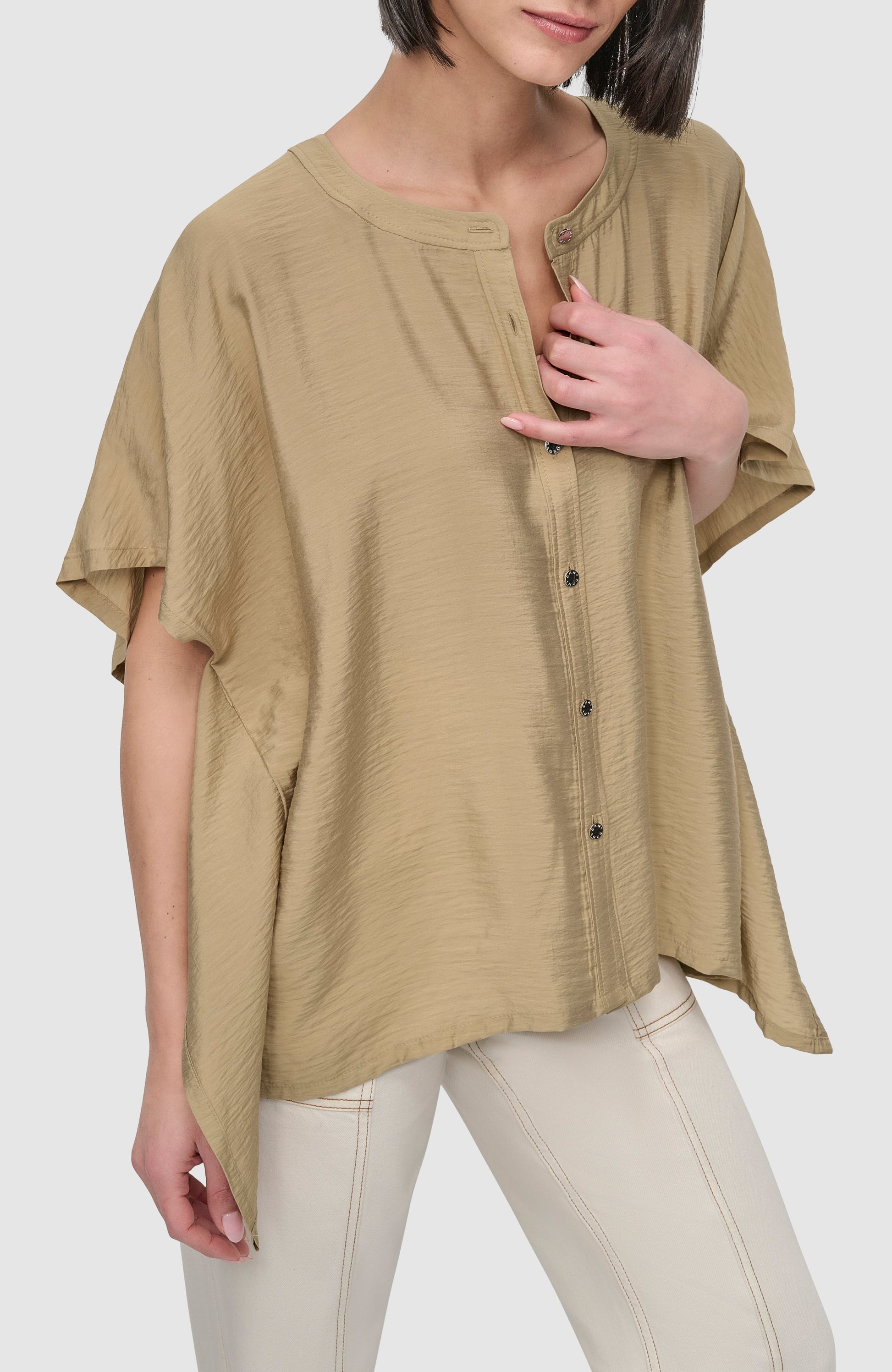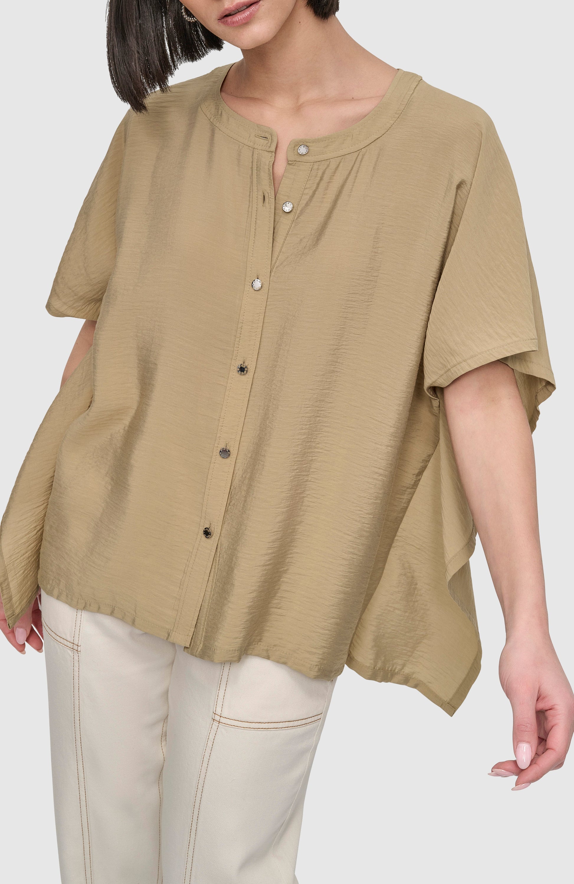 This DKNY Flowy Rumpled Voile top features short sleeves and a mandarin collar, combining comfort with a refined silhouette. The front button closure adds a classic touch, while the lightweight, flowy fabric ensures effortless movement and breathability, perfect for a polished yet relaxed look.