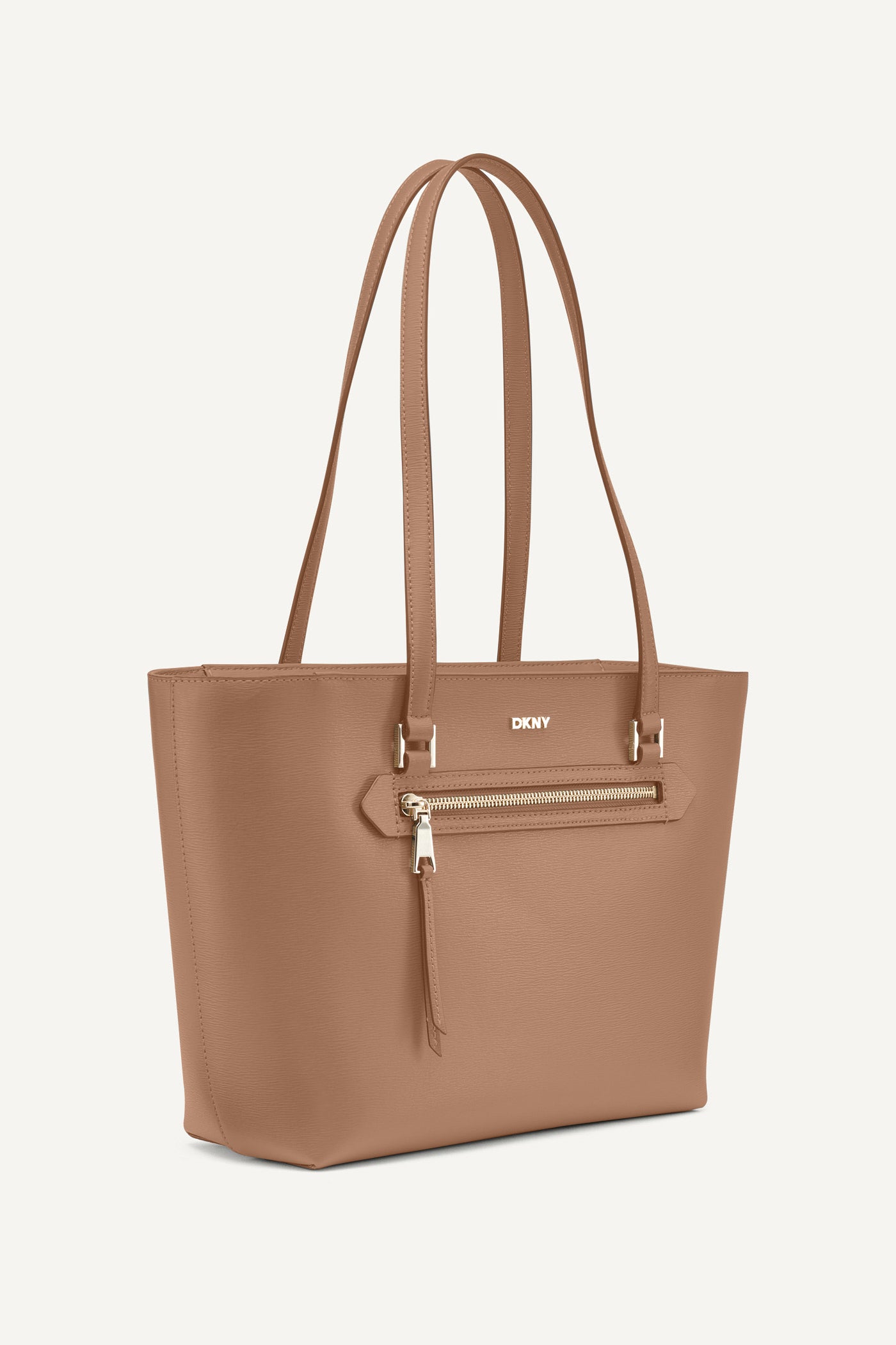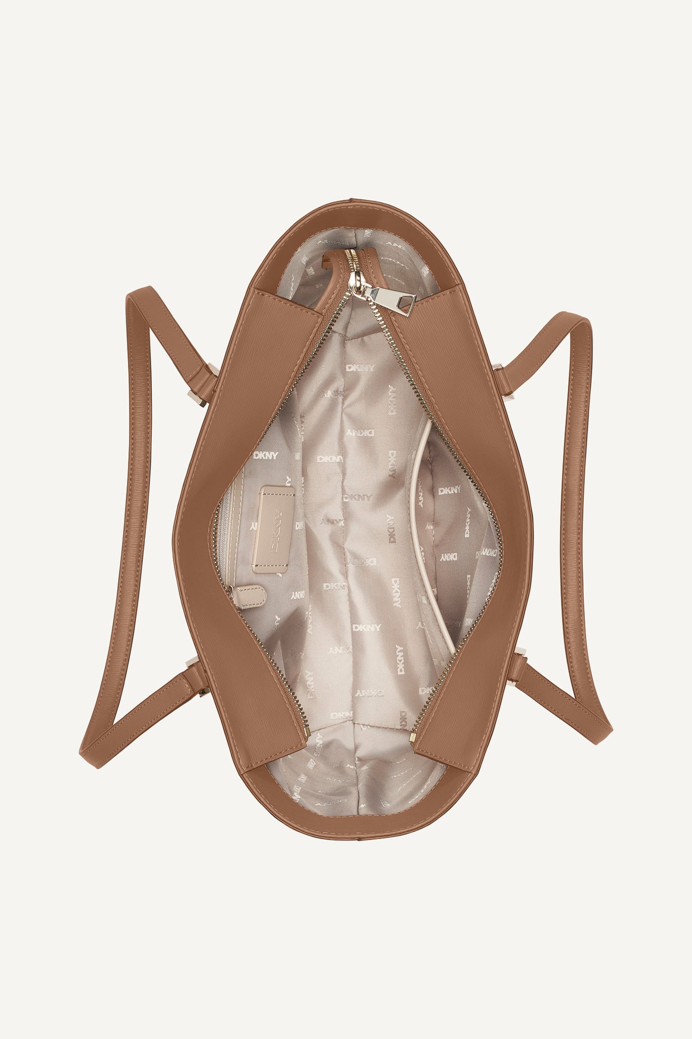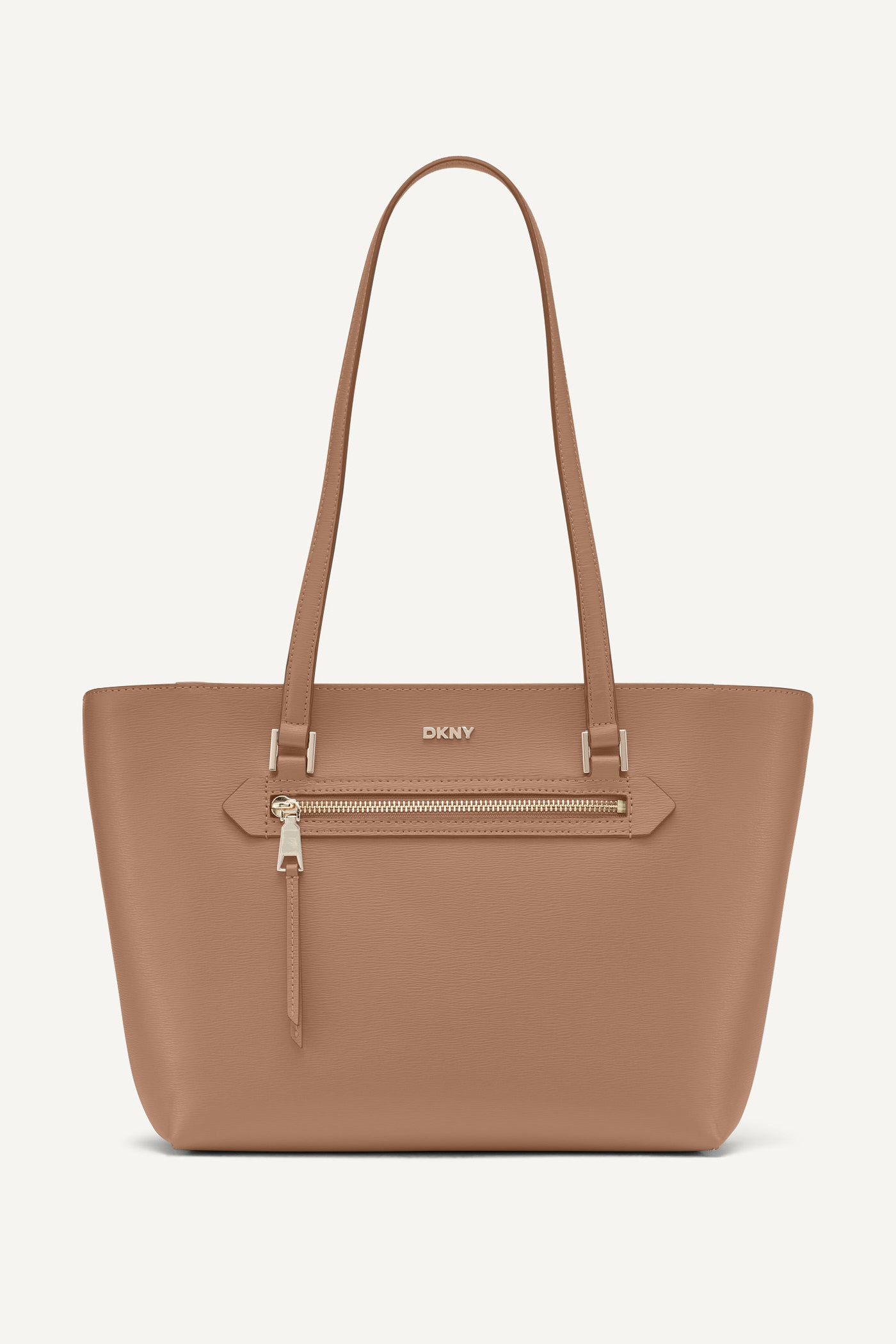 Introducing the DKNY Bryant Ave Medium Tote in elegant beige. This versatile bag combines style and functionality, featuring ample space for your essentials. Crafted with premium materials, its perfect for any occasion, effortlessly elevating your outfit with a touch of sophistication.