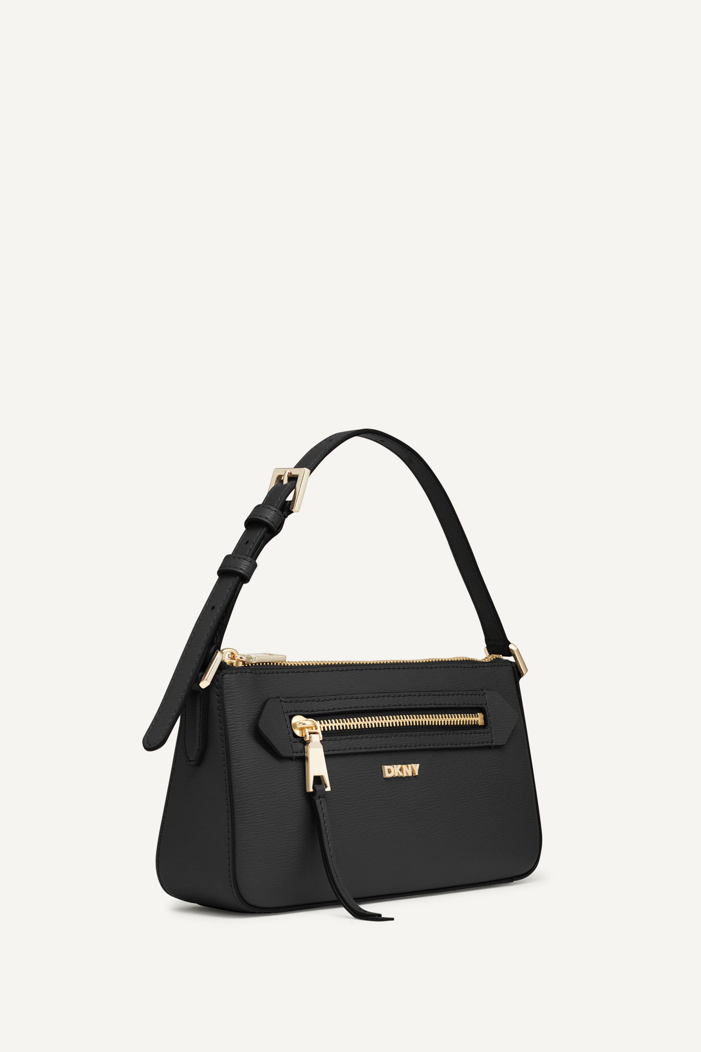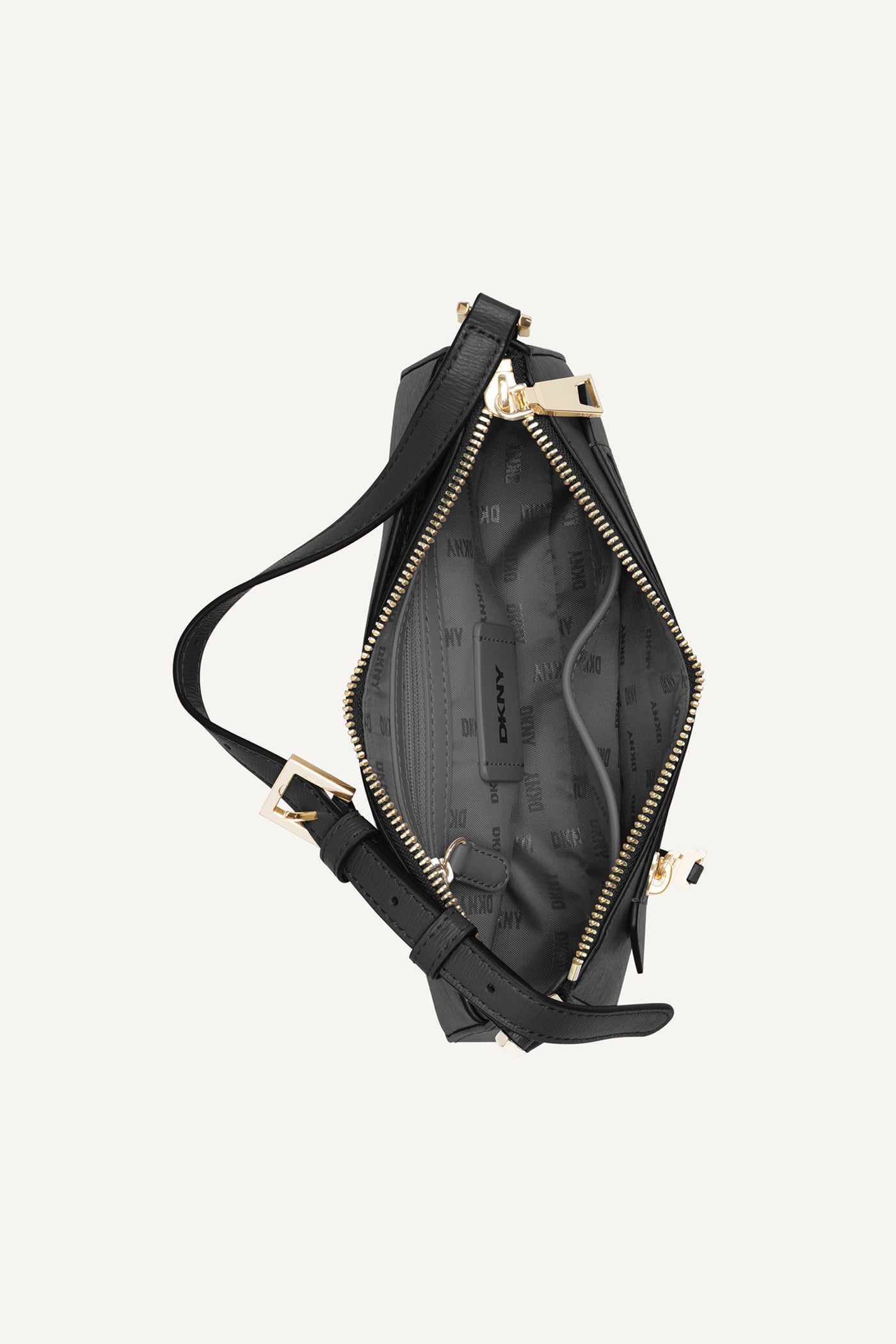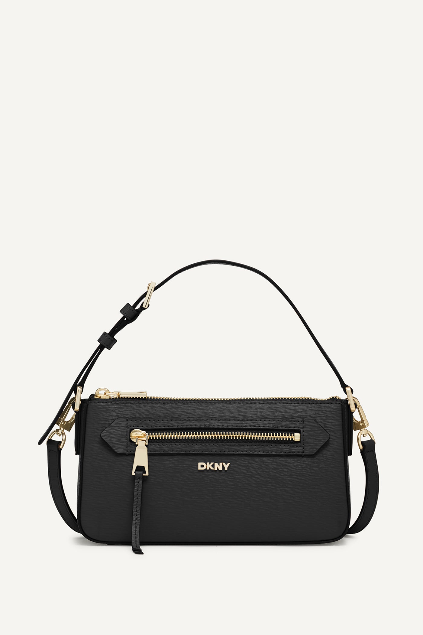 This chic DKNY Bryant Ave Small Top Zip Demi Crossbody Bag in classic black effortlessly elevates any ensemble. Perfectly sized for essentials, it combines functionality with sleek elegance, featuring superior craftsmanship and versatile style for fashion-forward individuals on the go.