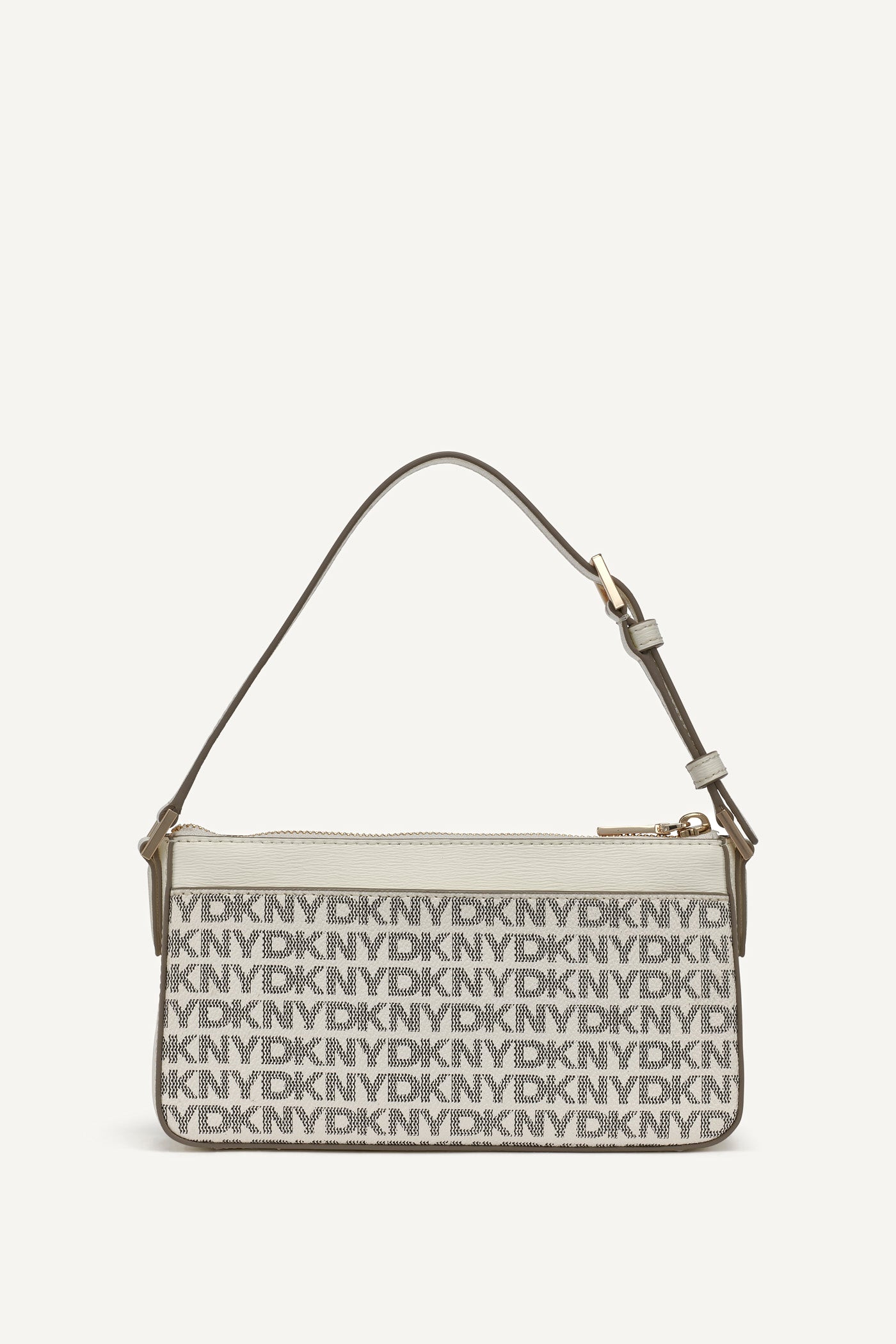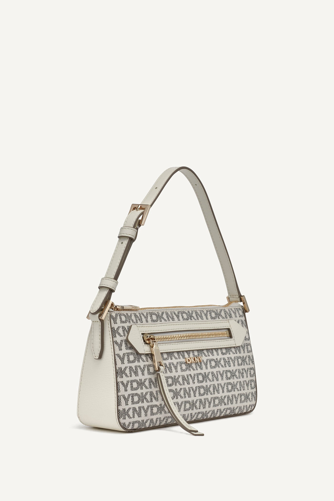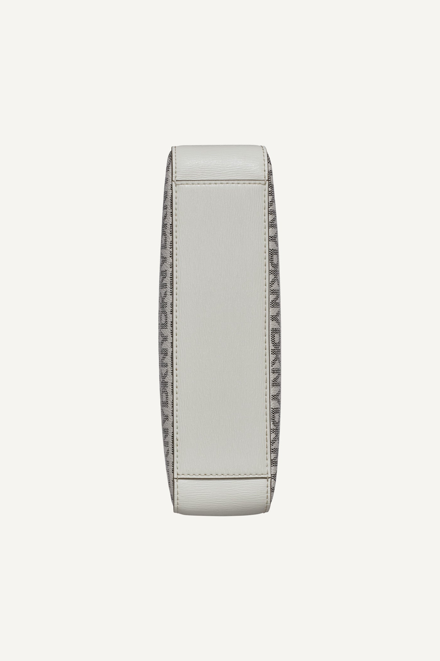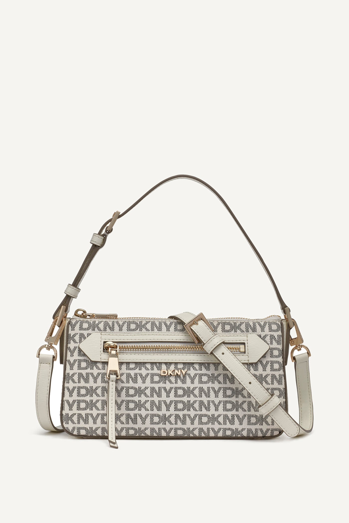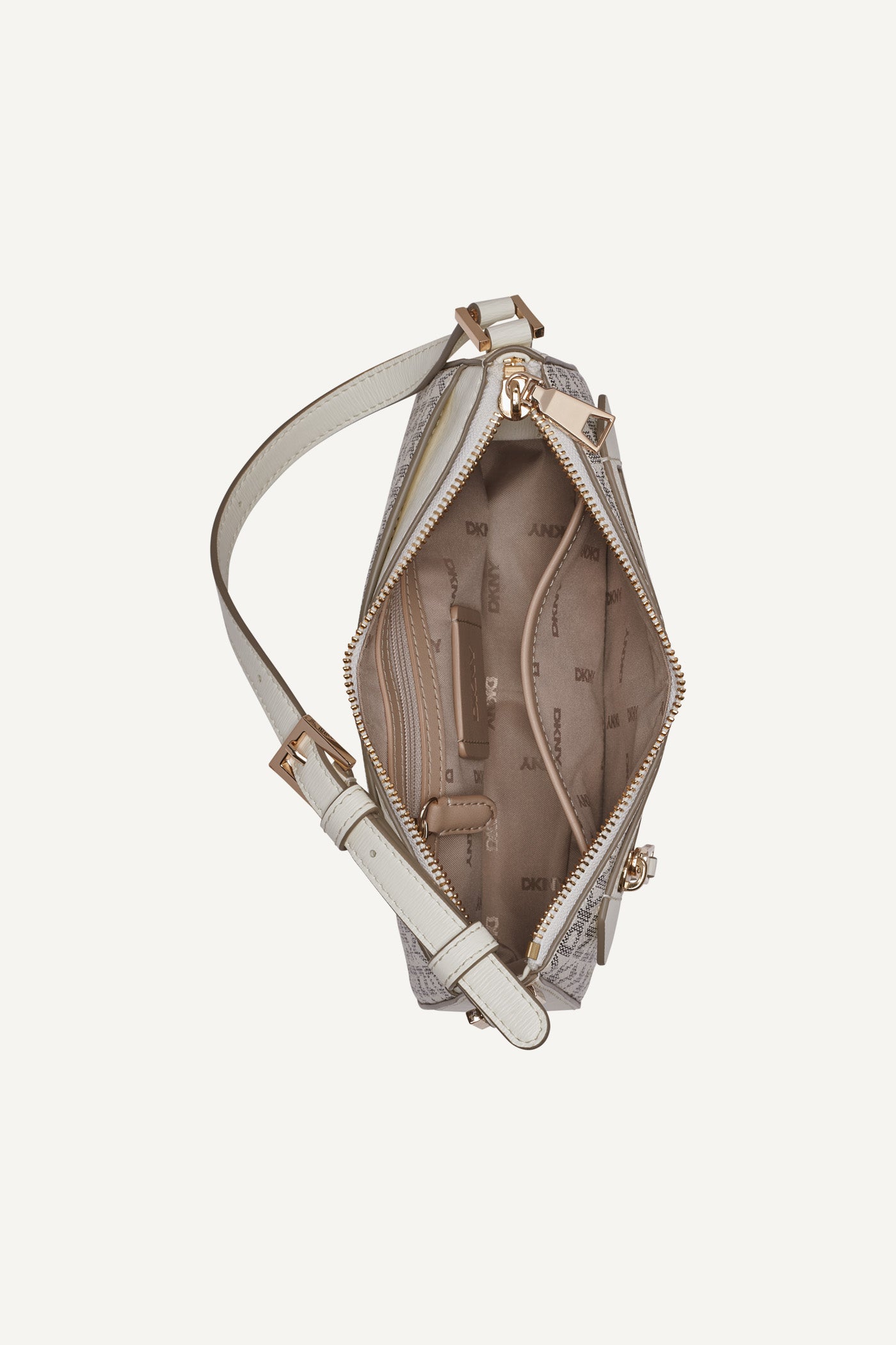 Elevate your style with the DKNY BRYANT AVE Small Top Zip Demi Crossbody Bag. In elegant white, this versatile accessory offers effortless sophistication and convenience, featuring a sleek design and compact size that's perfect for any occasion.