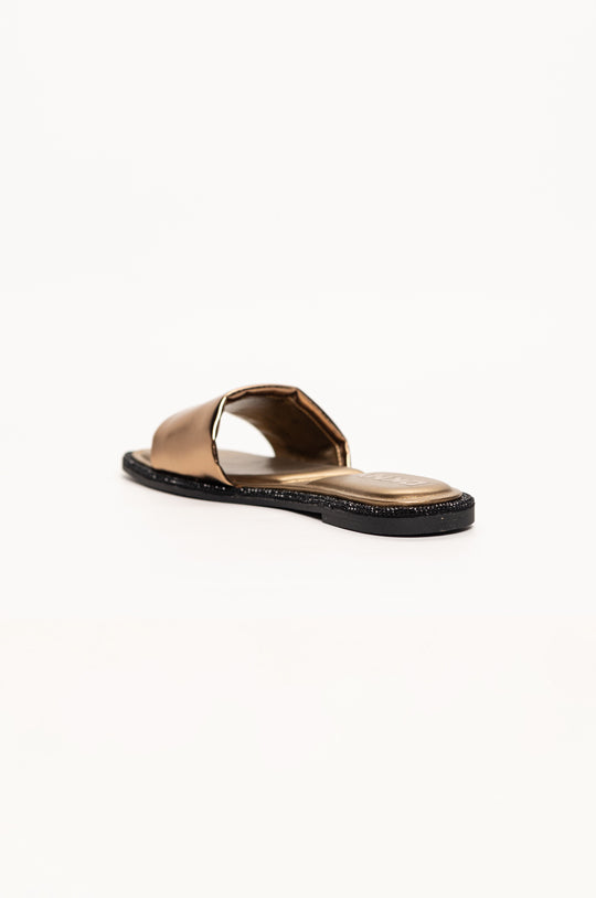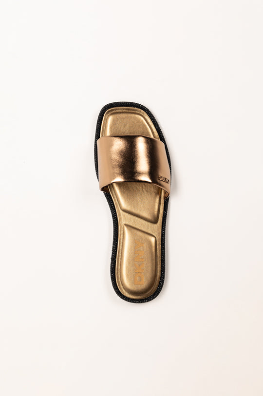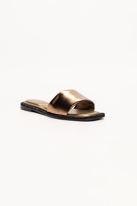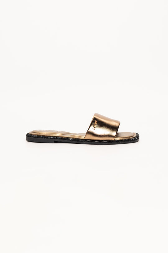 Step into elegance with the DKNY BAVANT FLAT SLIDE in stunning bronze. Perfect for the Holiday season, these chic slides offer effortless style and comfort, making them an ideal choice for any festive ensemble. Elevate your wardrobe with sophistication.