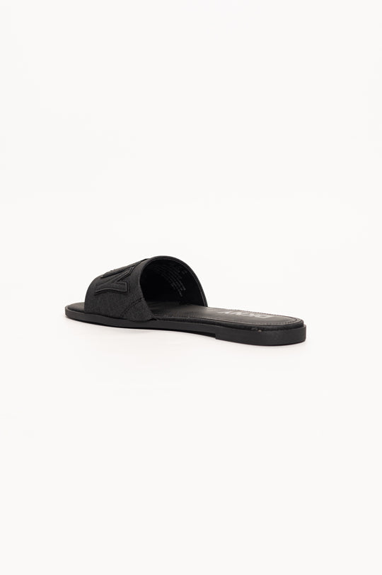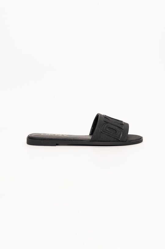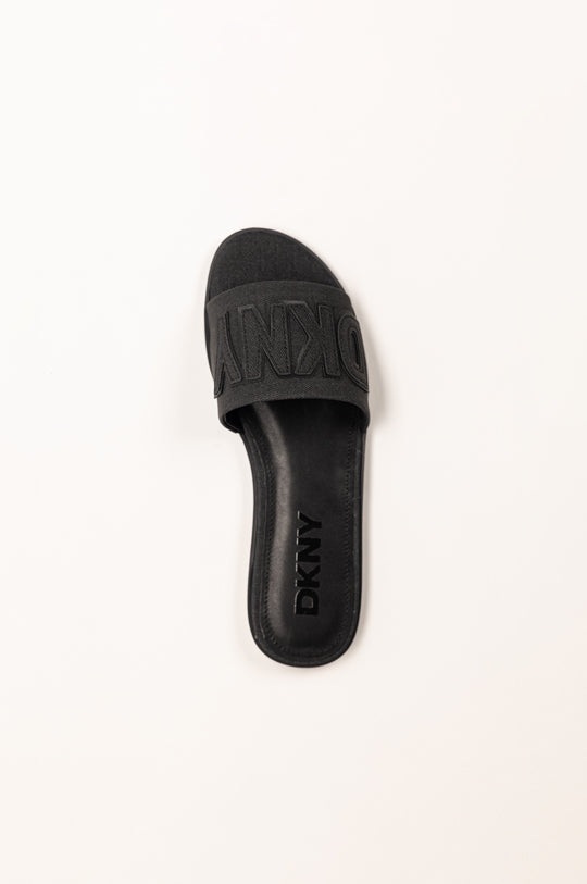 Elevate your holiday style with the DKNY Willow Flat Slide in classic black. Perfect for any occasion, these chic slides blend comfort and sophistication effortlessly. Ideal for the Holiday24 season, they'll be your go-to footwear for festive celebrations.