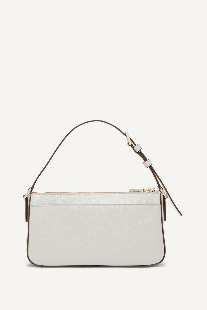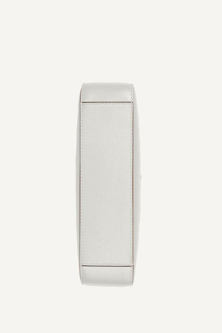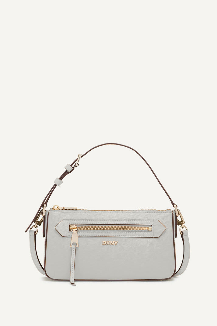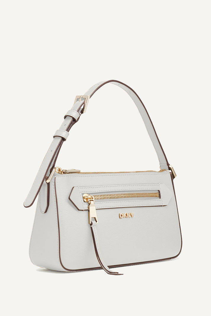 Experience effortless style with the DKNY BRYANT AVE SMALL TOP ZIP DEMI CROSSBODY BAG in crisp WHITE. Sleek and compact, this versatile bag is perfect for any occasion, offering secure storage with a top zipper and adjustable crossbody strap.